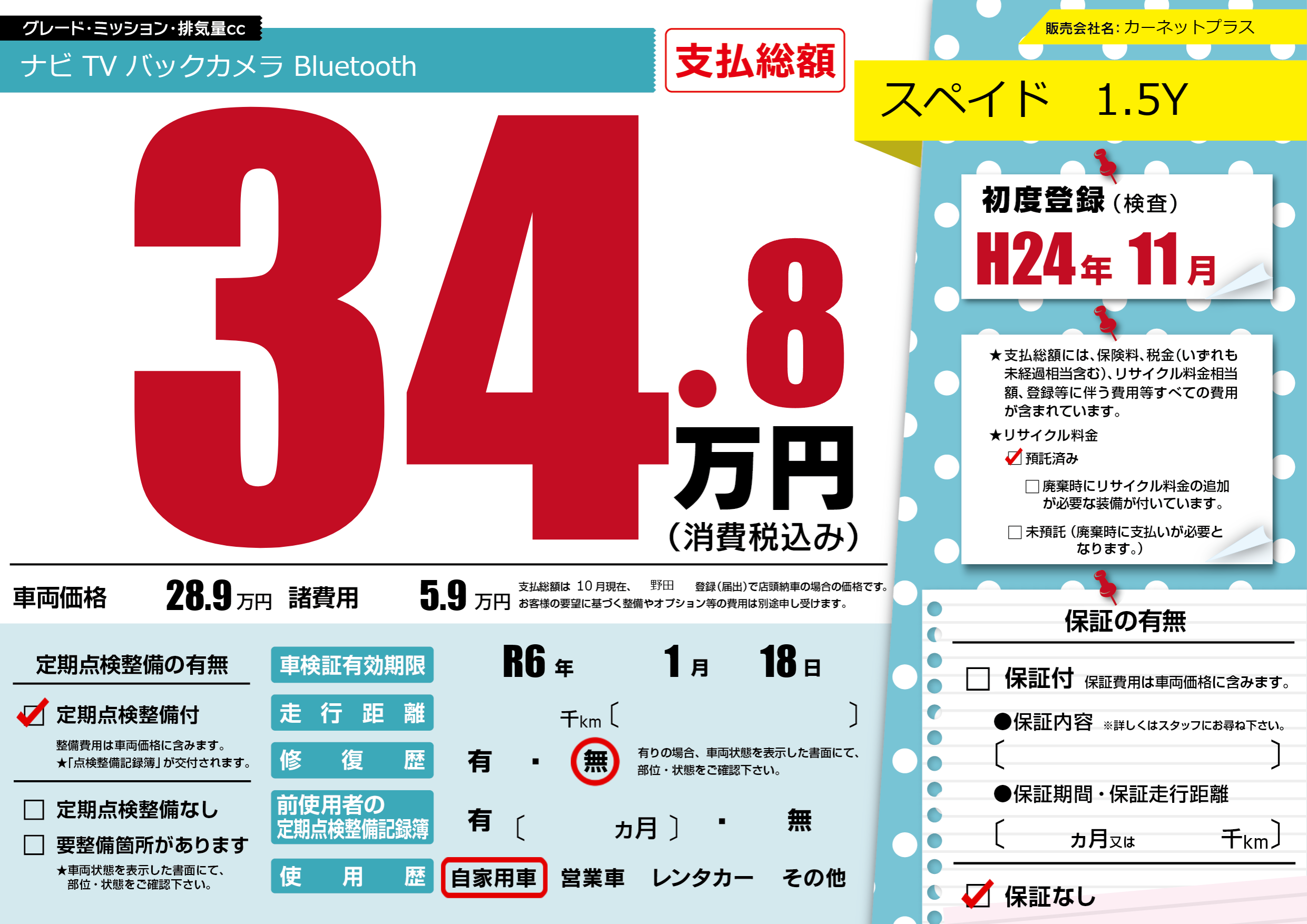 | 車名 | スペイド 1.5Y | グレード ミッション 排気量 |