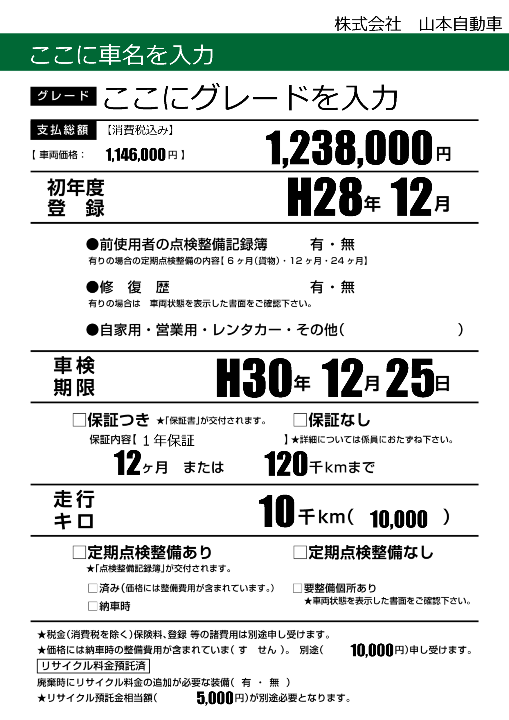 | 車名 | ここに車名を入力 | グレード ミッション 排気量 |