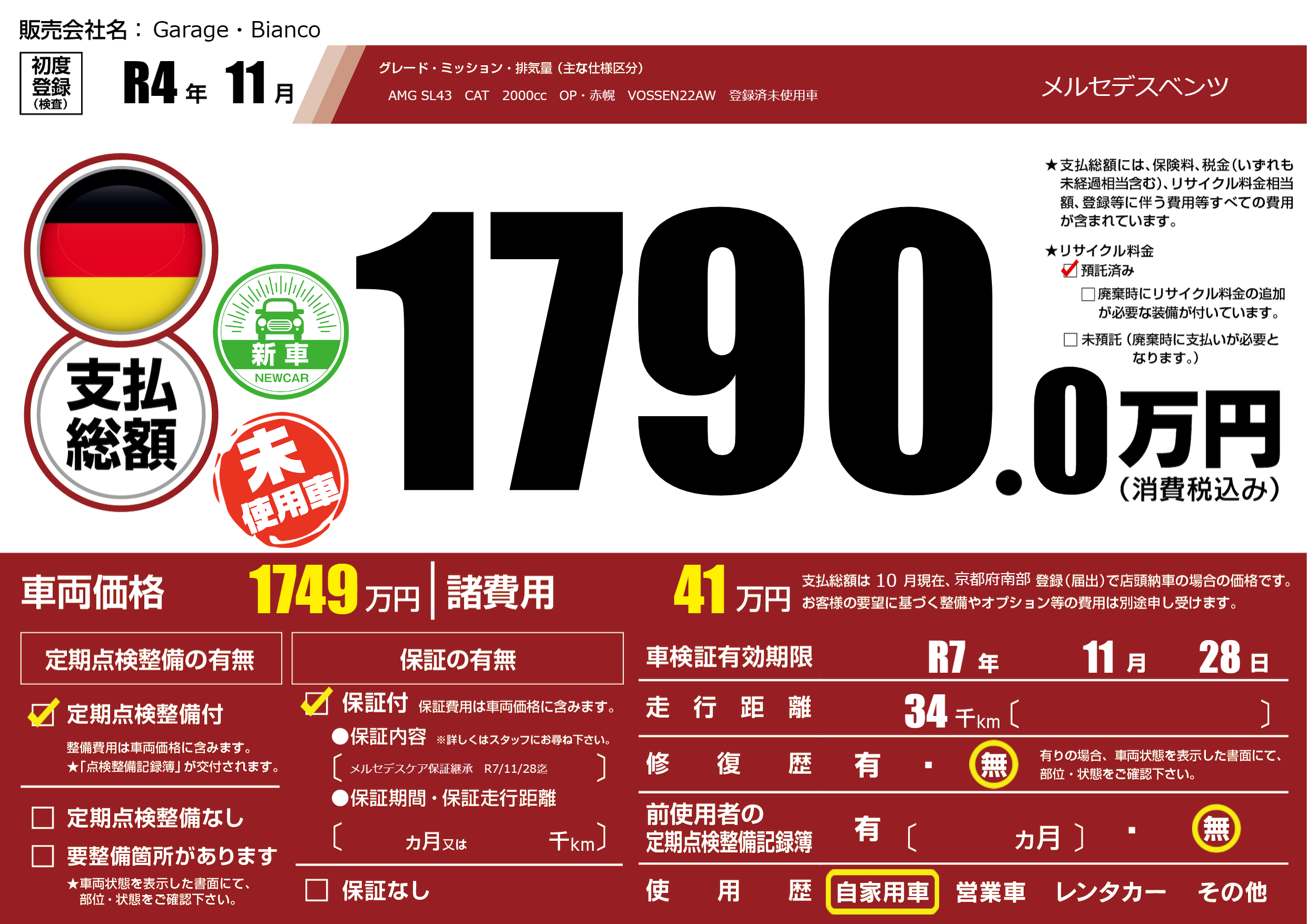 AMG SL43 CAT 2000cc OP・赤幌 VOSSEN22AW 登録済未使用車 |