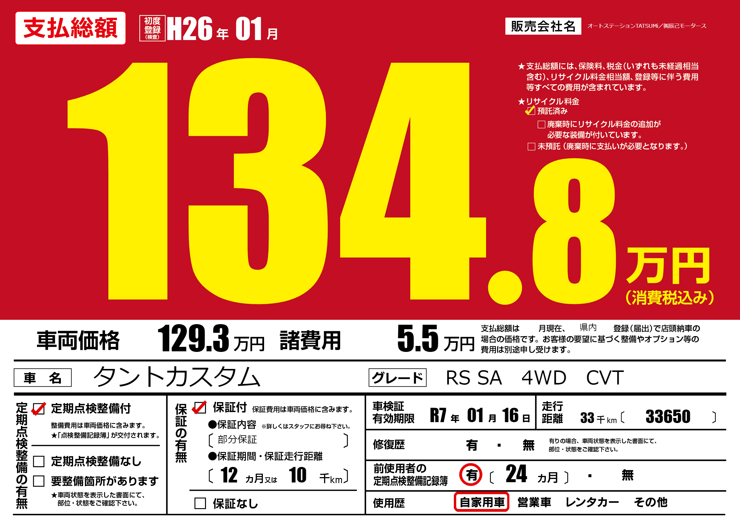 | 車名 | タントカスタム | グレード ミッション 排気量 |