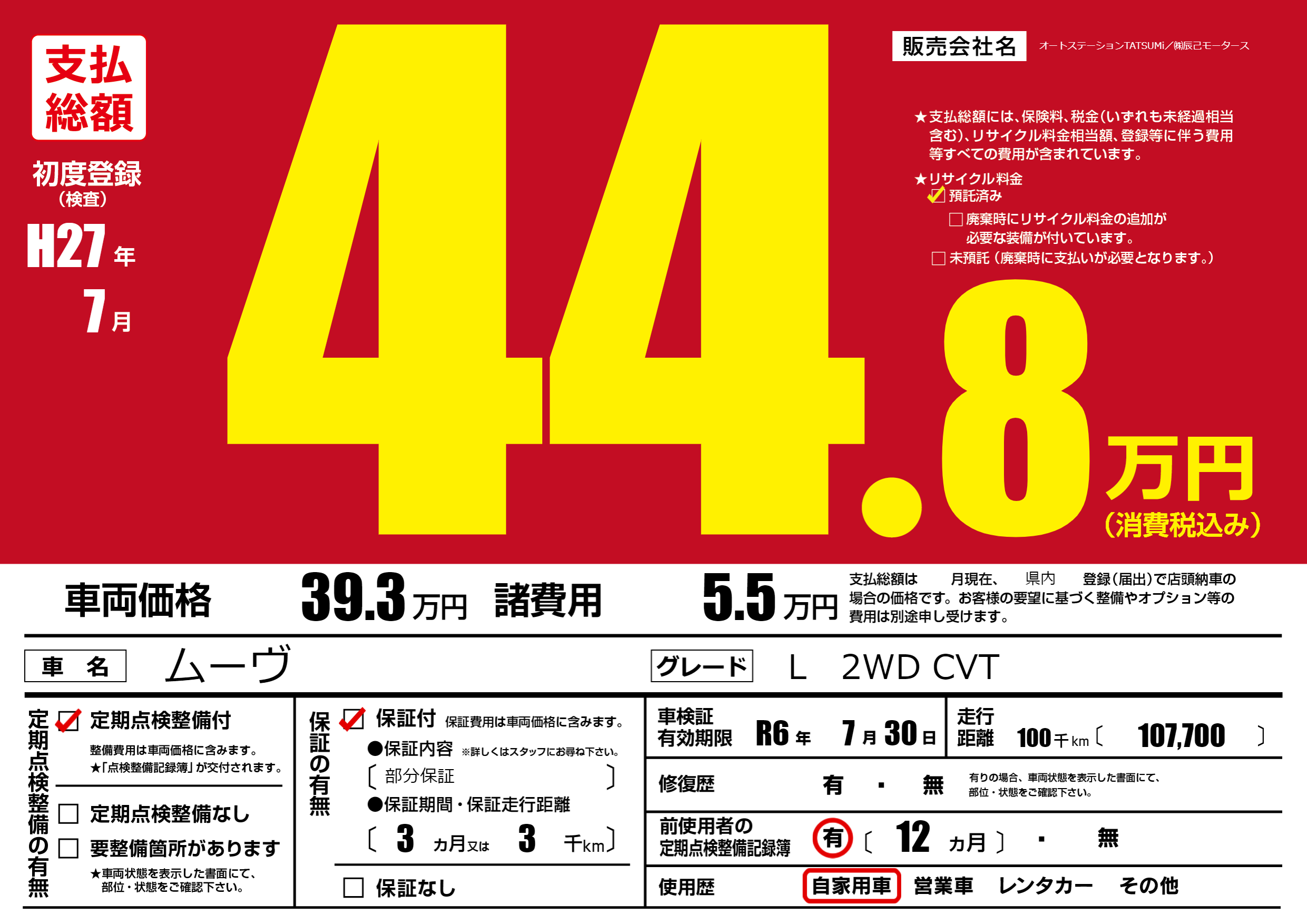 | 走行キロ | 10万km | 初年度登録 | H27年7月 |