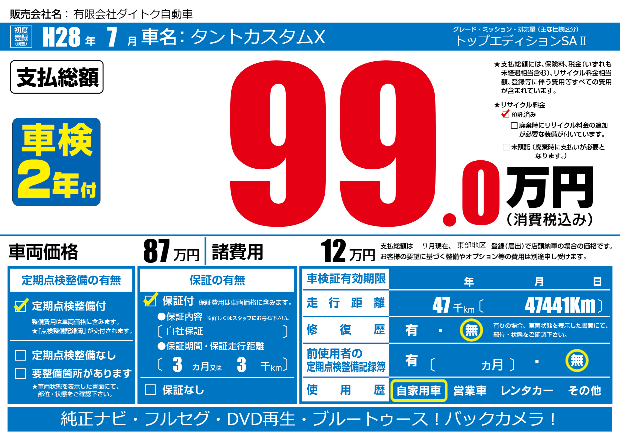 | 車名 | タントカスタムX | グレード ミッション 排気量 |
