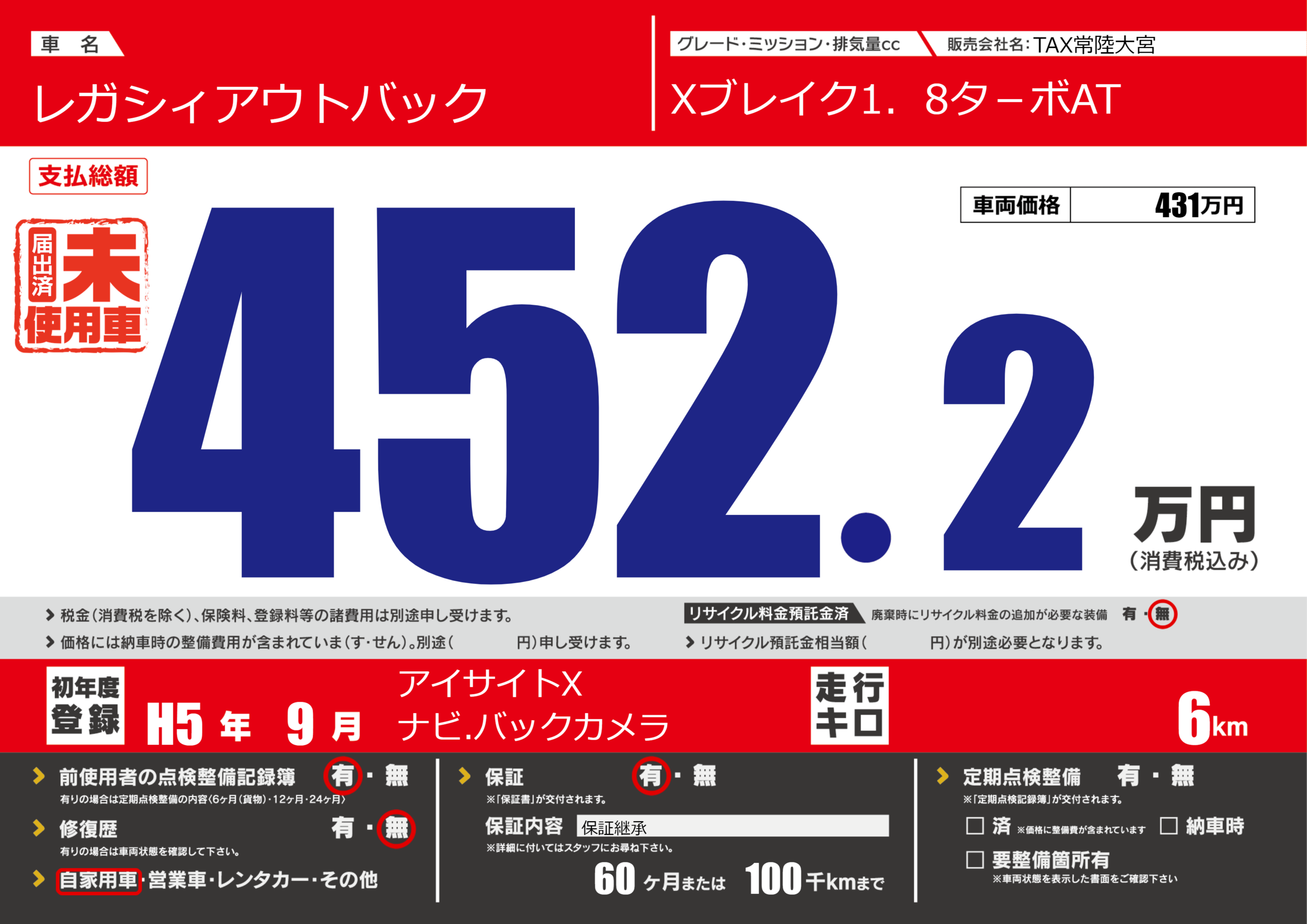 保証付き 保証内容(保証継承) 60ヶ月または(100)千kmまで |