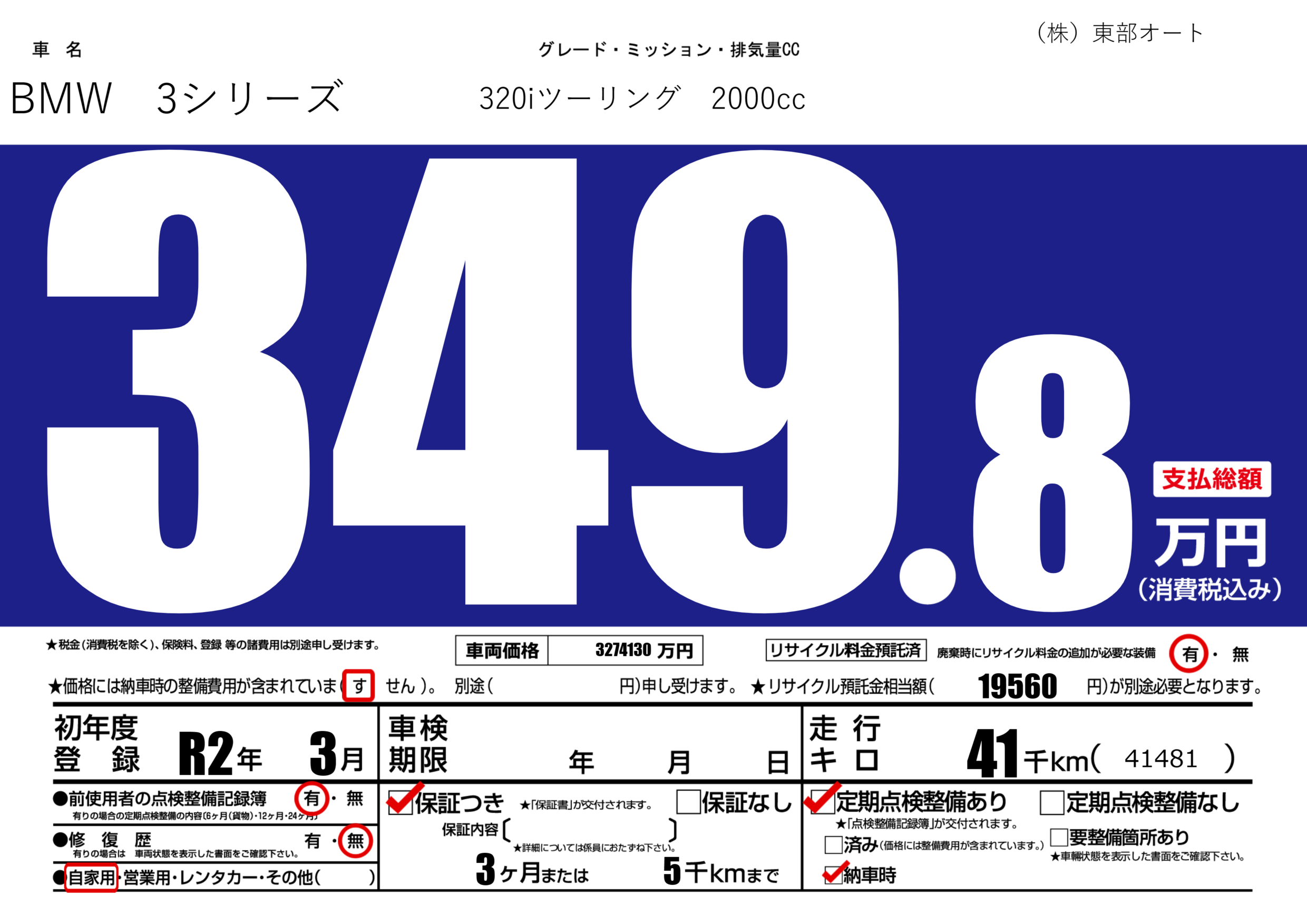 | 車名 | BMW 3シリーズ | グレード ミッション 排気量 |