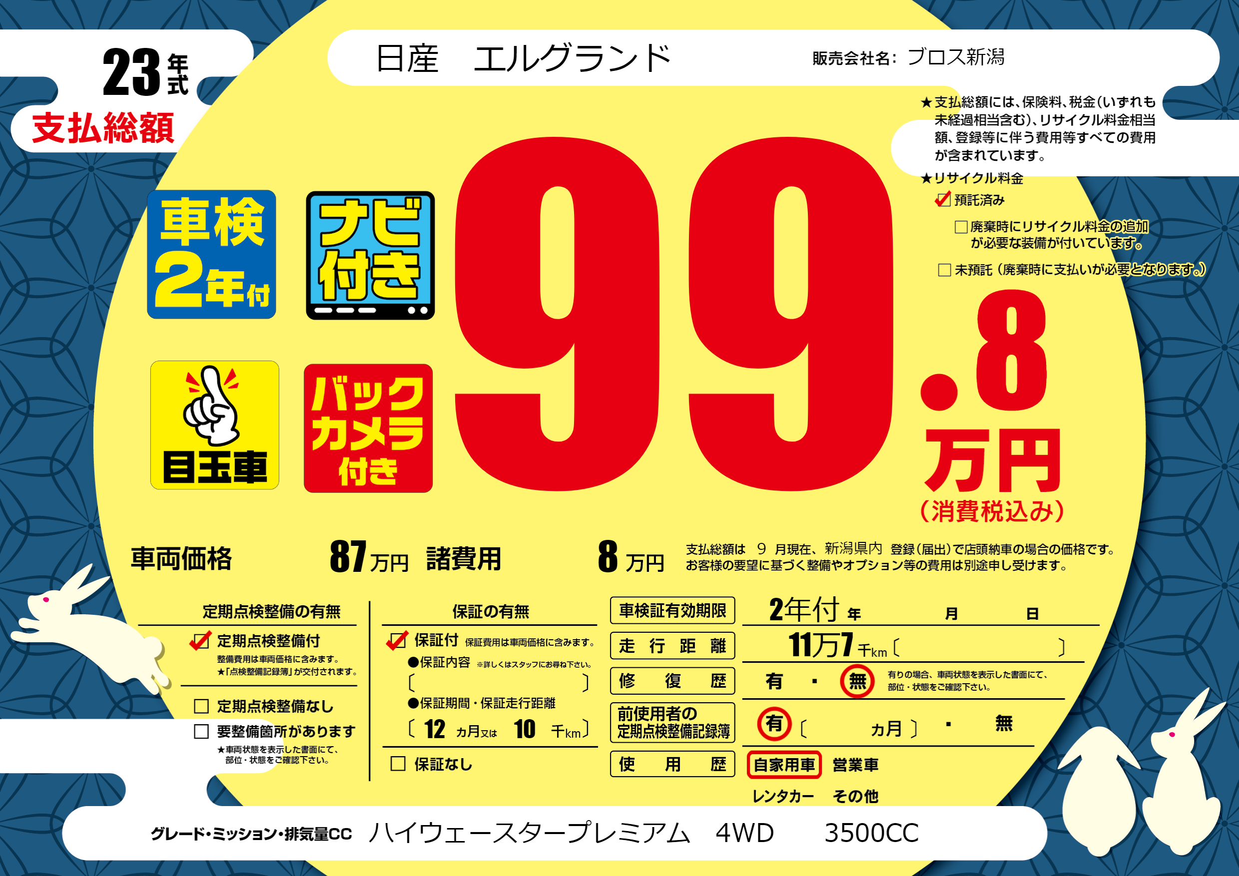 | 車名 | 日産 エルグランド | グレード ミッション 排気量 |