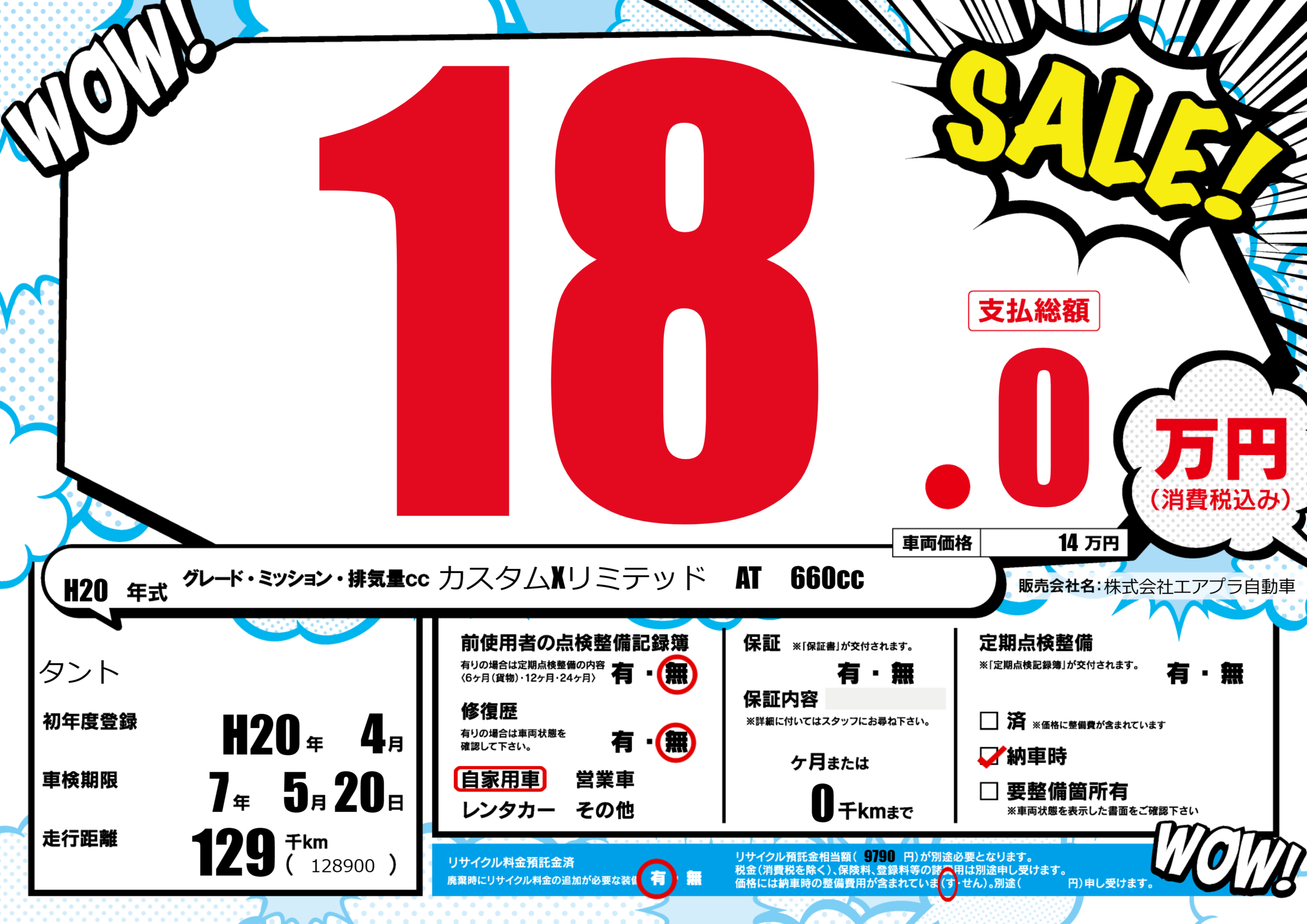 | 走行キロ | 12.9万km | 初年度登録 | H20年4月 |