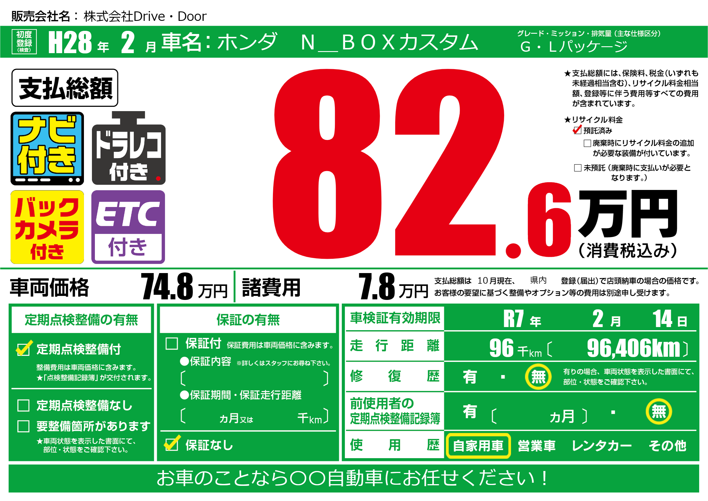 | 走行キロ | 9.6万km | 初年度登録 | H28年2月 |