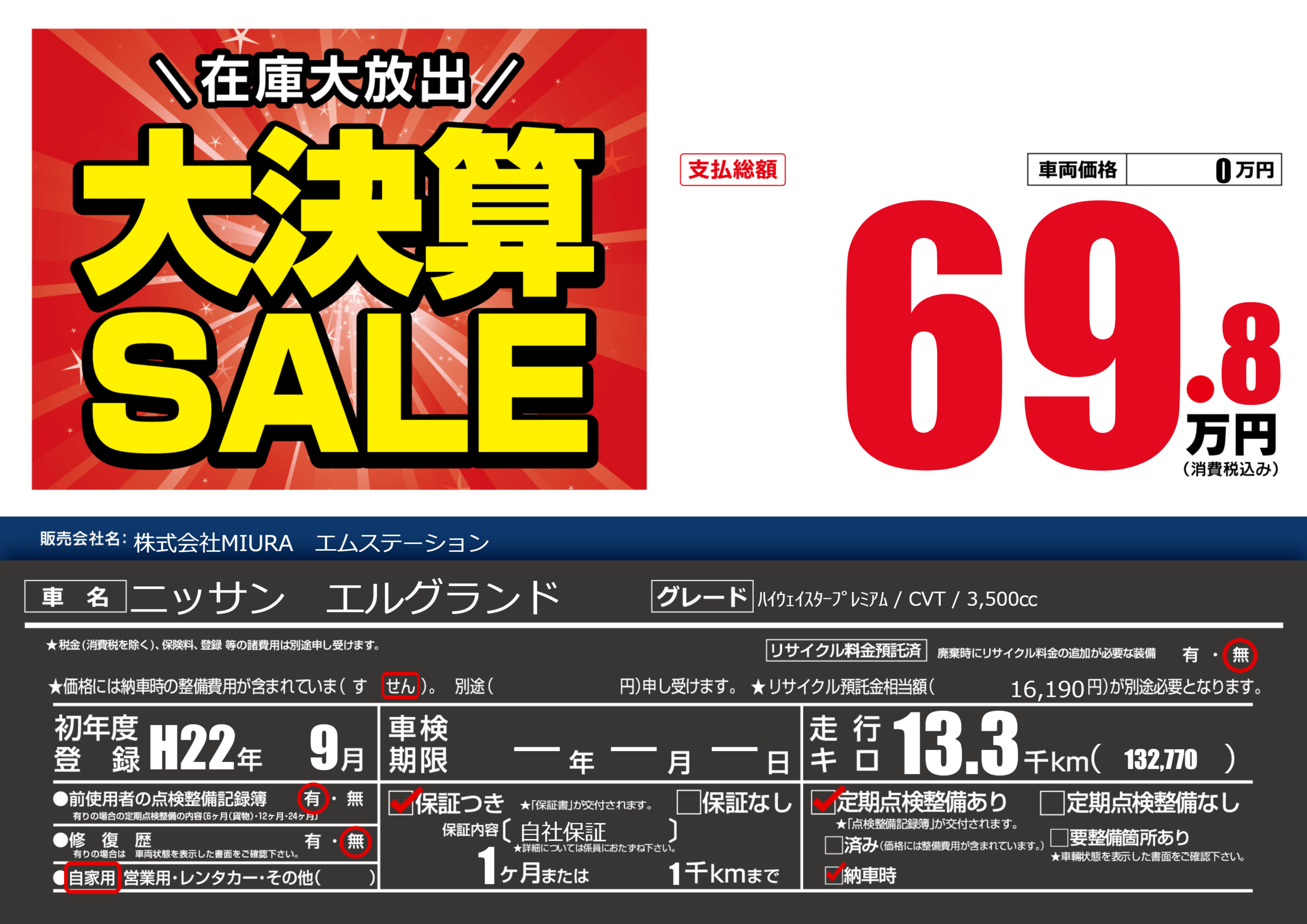 | 定期点検整備 | 定期点検整備あり 納車時あり | ||