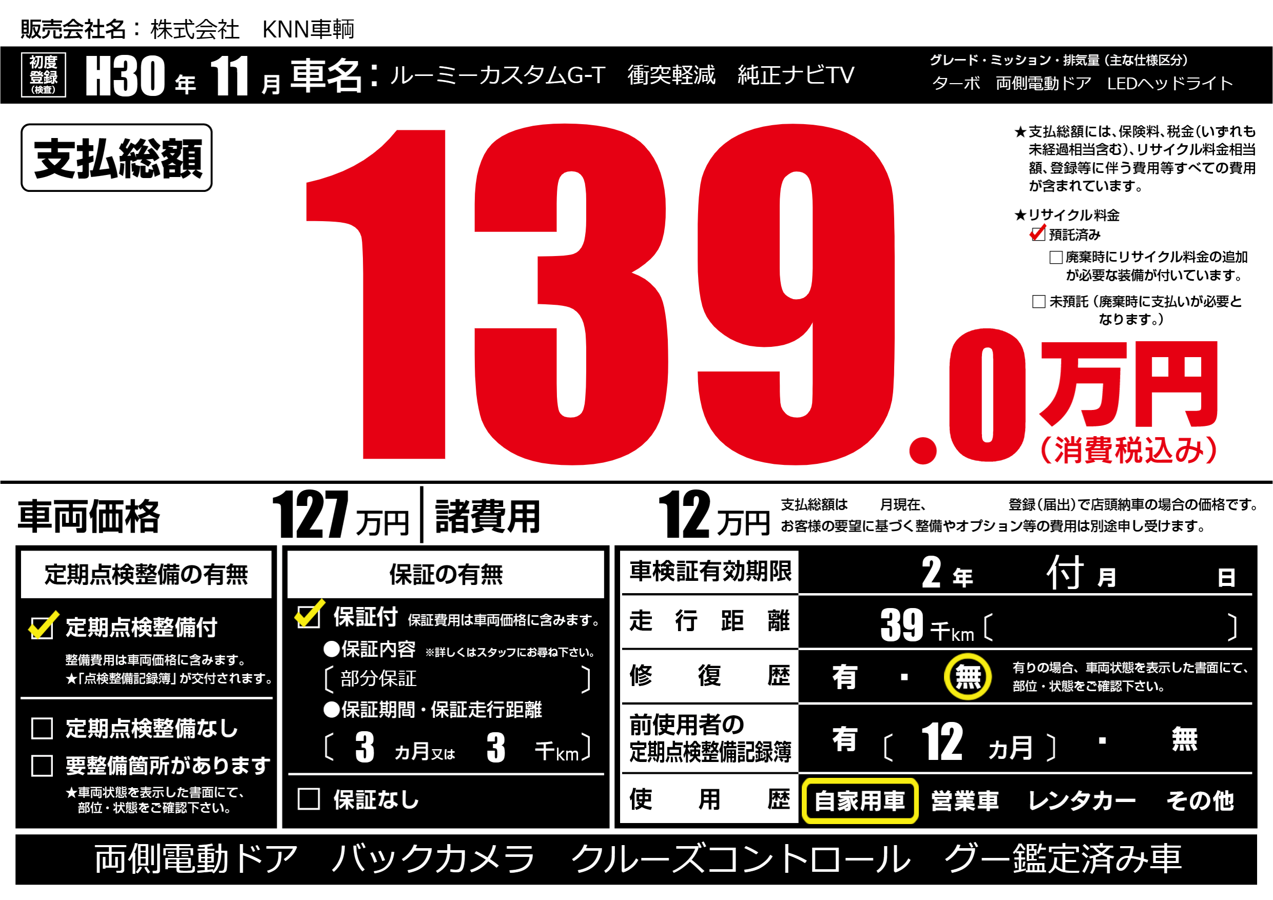 | 走行キロ | 3.9万km | 初年度登録 | H30年11月 |