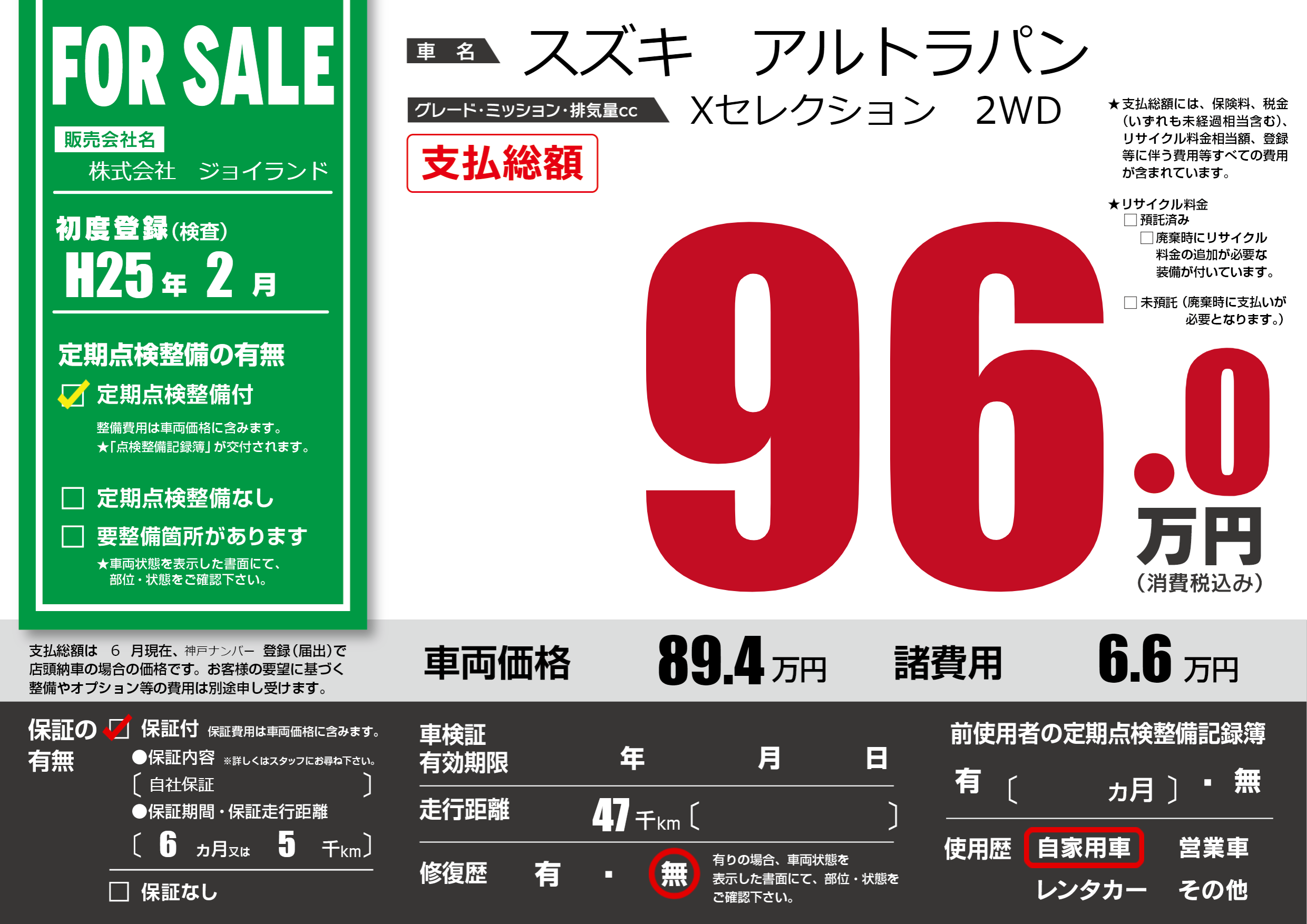 | 走行キロ | 4.7万km | 初年度登録 | H25年2月 |