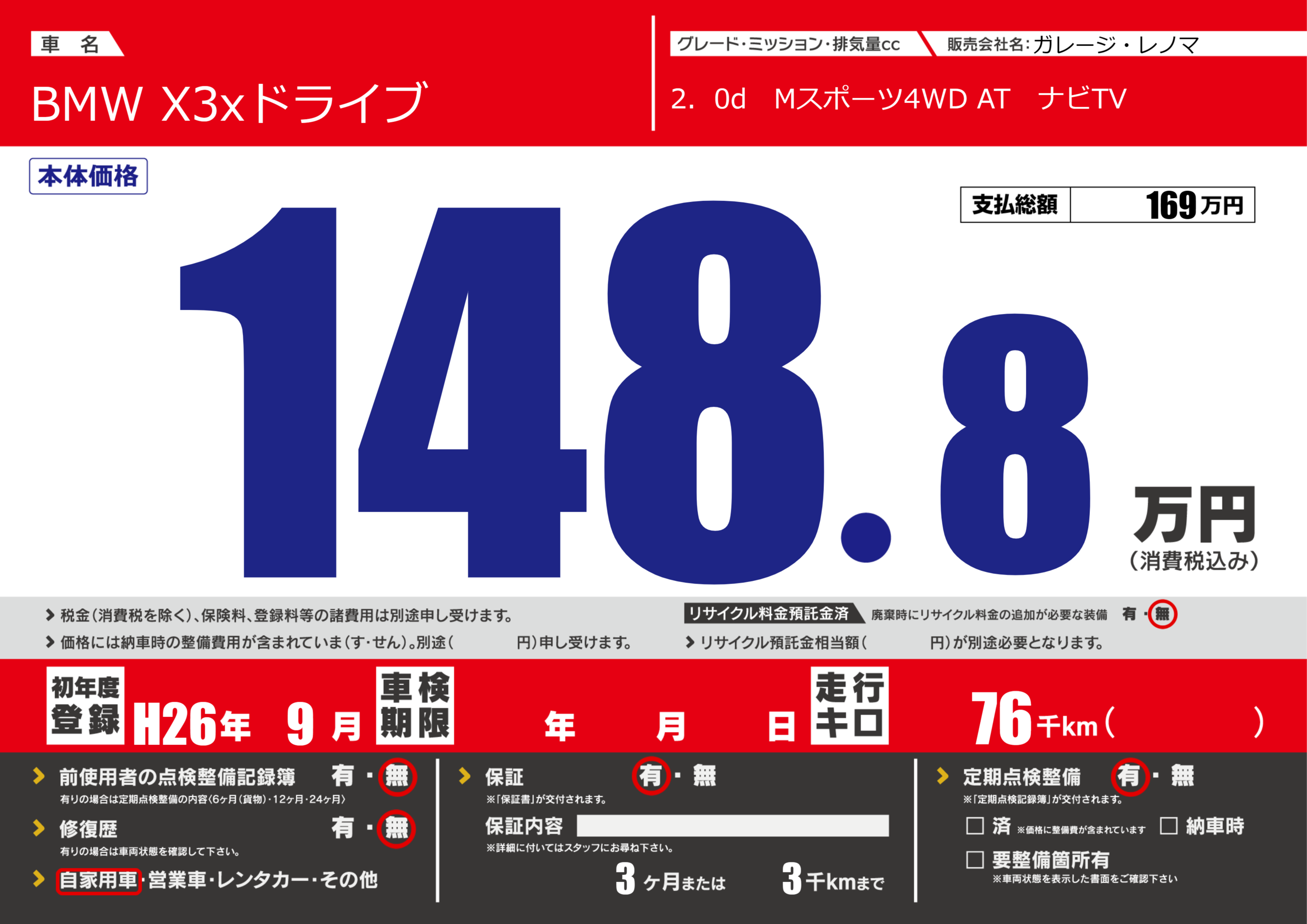 保証付き 保証内容(---) 3ヶ月または(3)千kmまで |