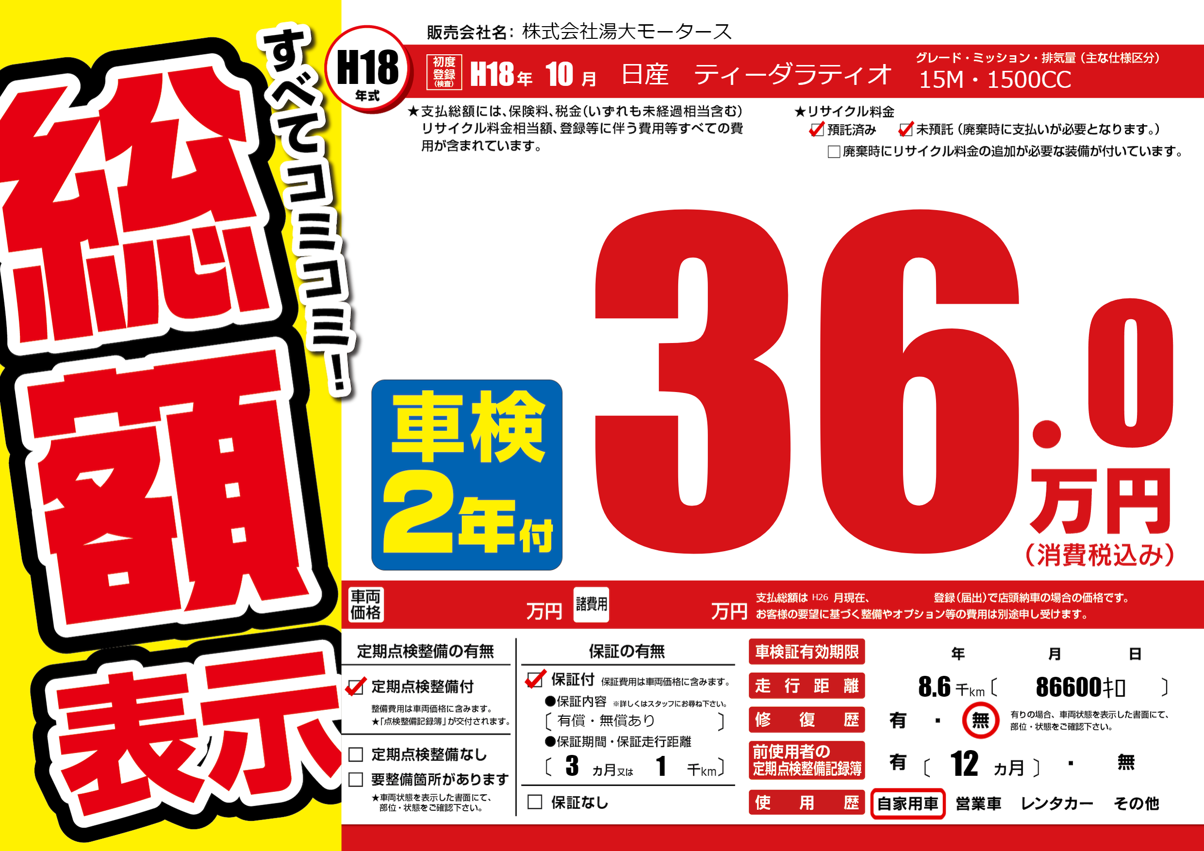| 車名 | 日産 ティーダラティオ | グレード ミッション 排気量 |