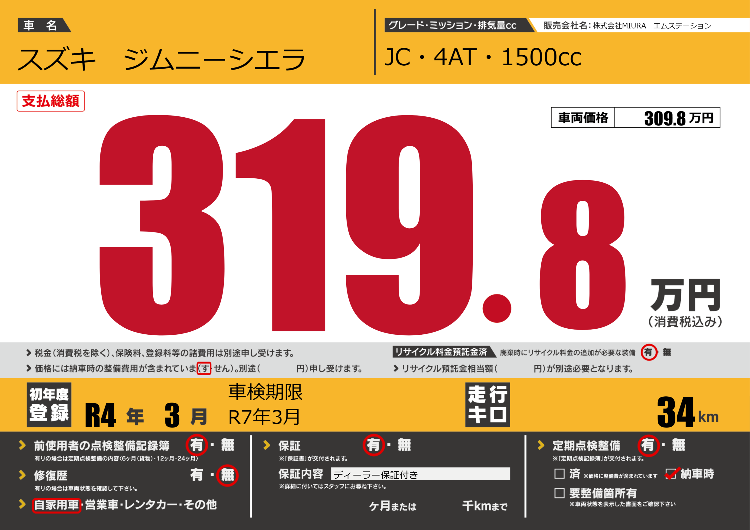 保証付き 保証内容(ディーラー保証付き) ---ヶ月または()千kmまで |