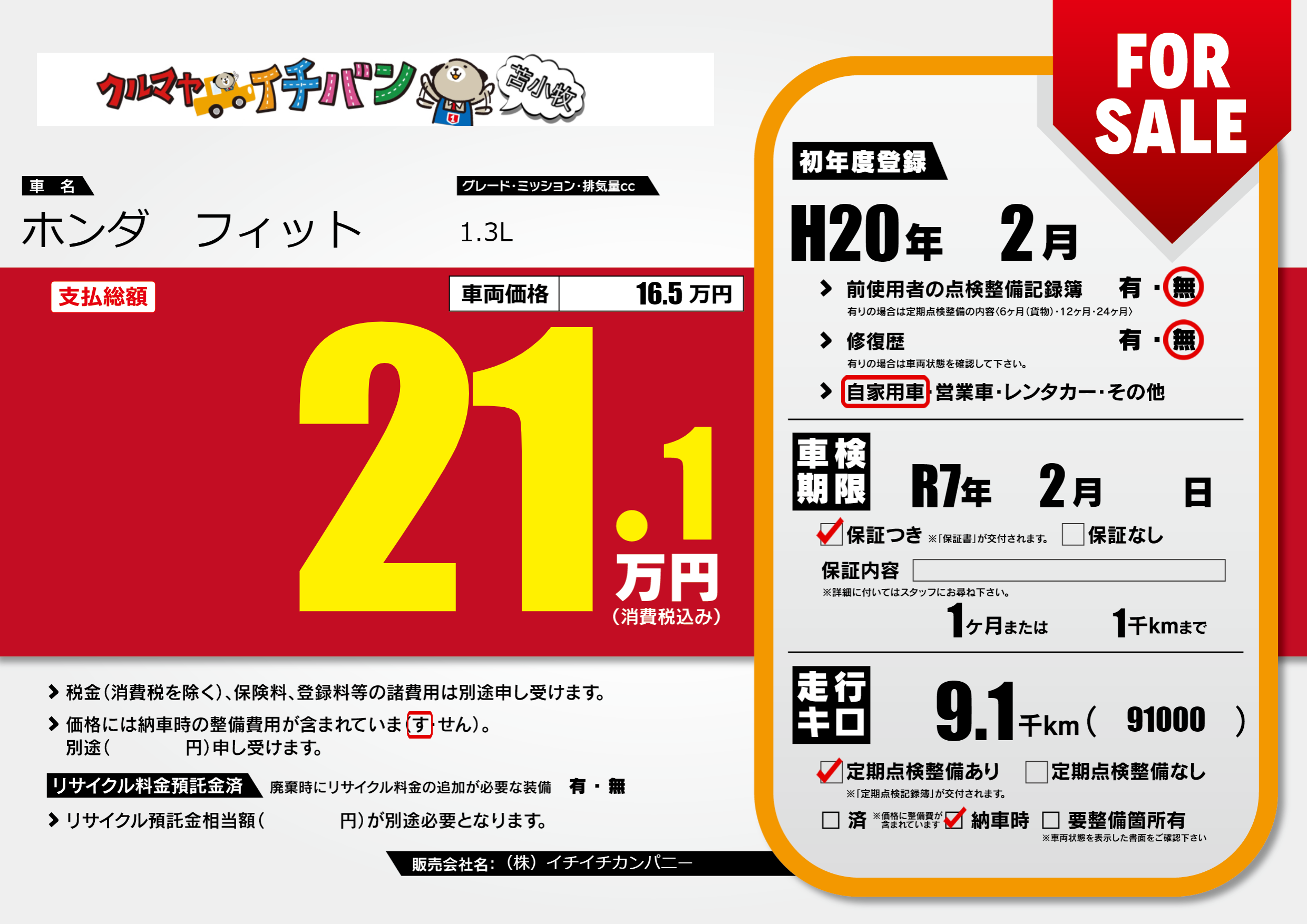 | 車名 | ホンダ フィット | グレード ミッション 排気量 |