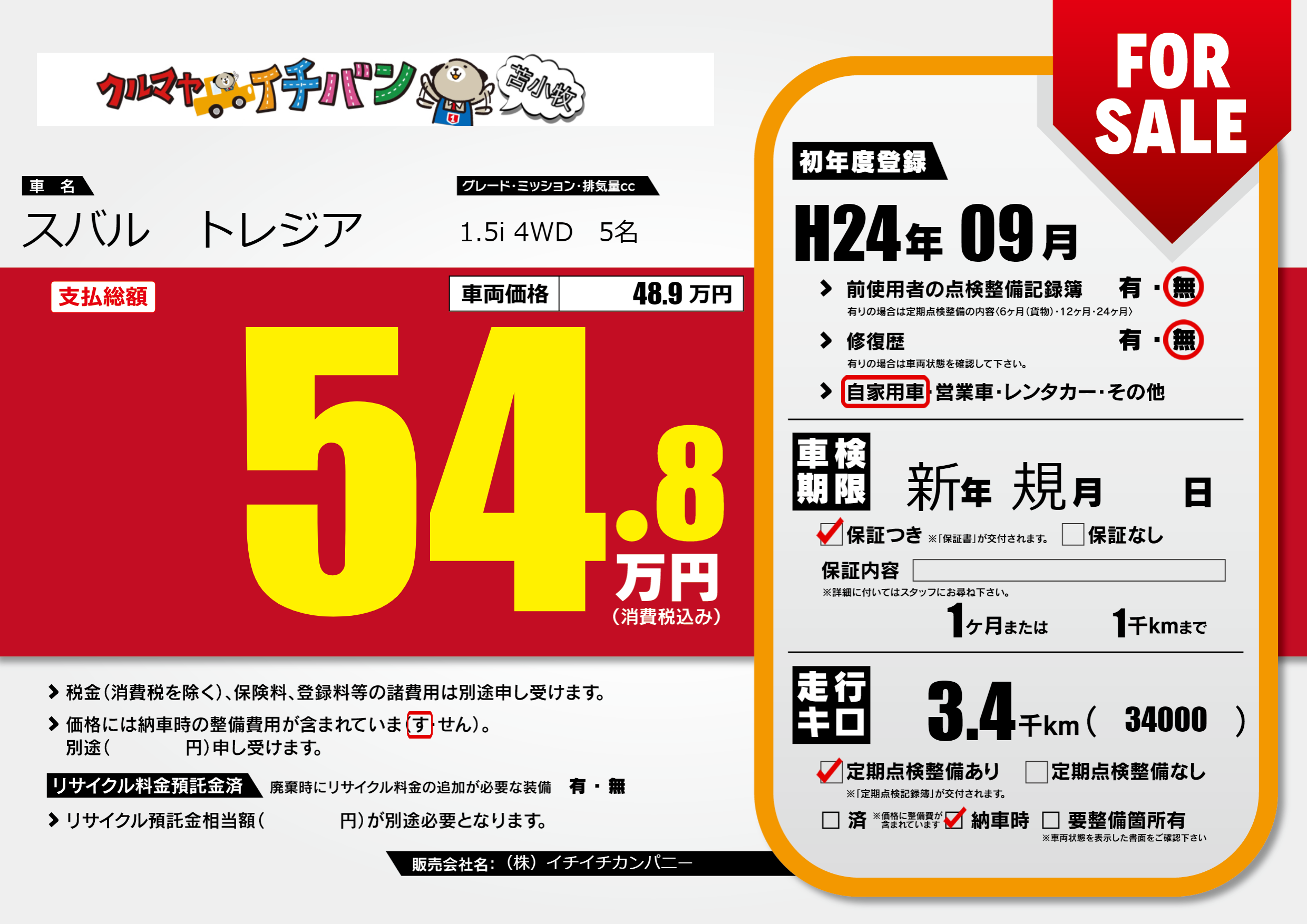 | 走行キロ | 0.3万km | 初年度登録 | H24年09月 |
