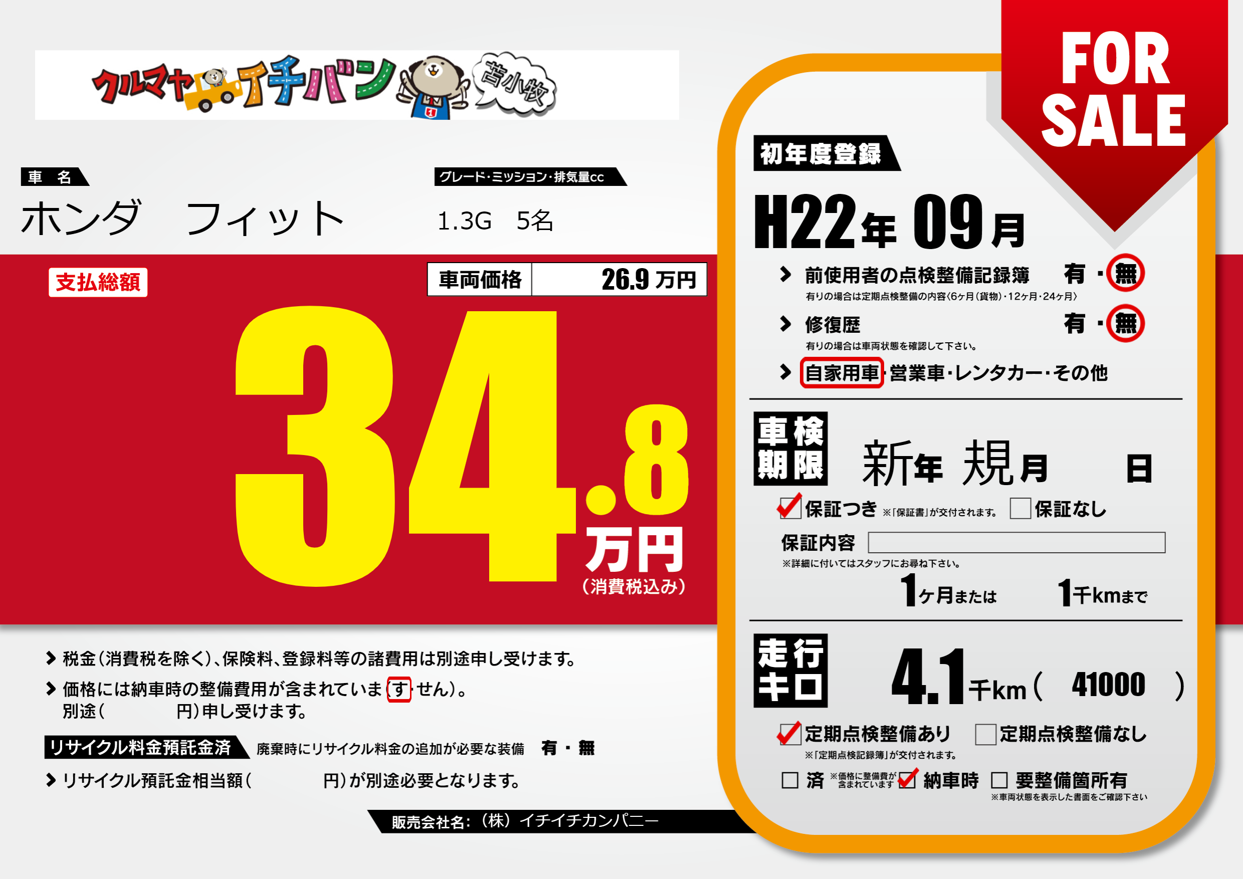 | 走行キロ | 0.4万km | 初年度登録 | H22年09月 |
