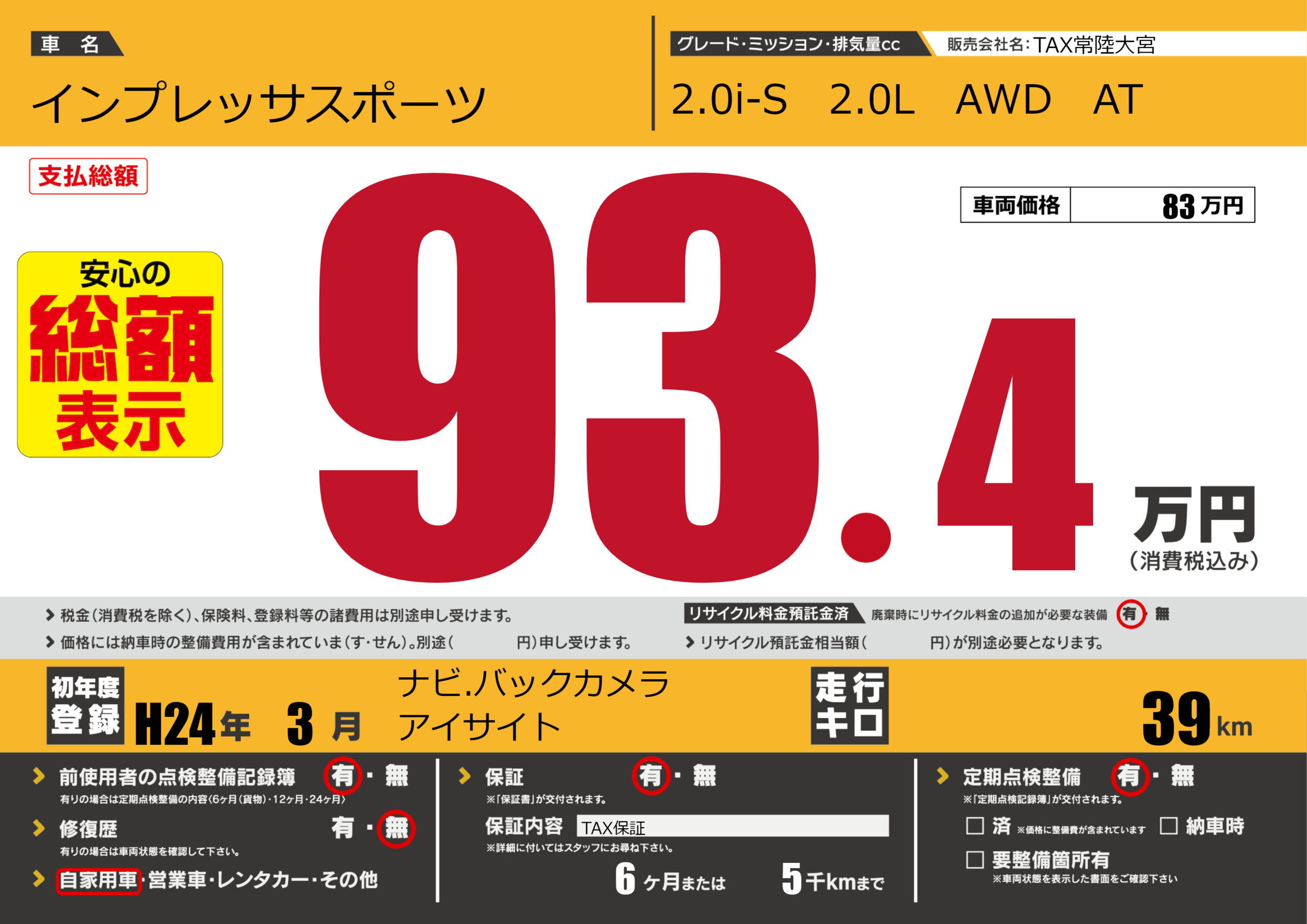 | 車名 | インプレッサスポーツ | グレード ミッション 排気量 |