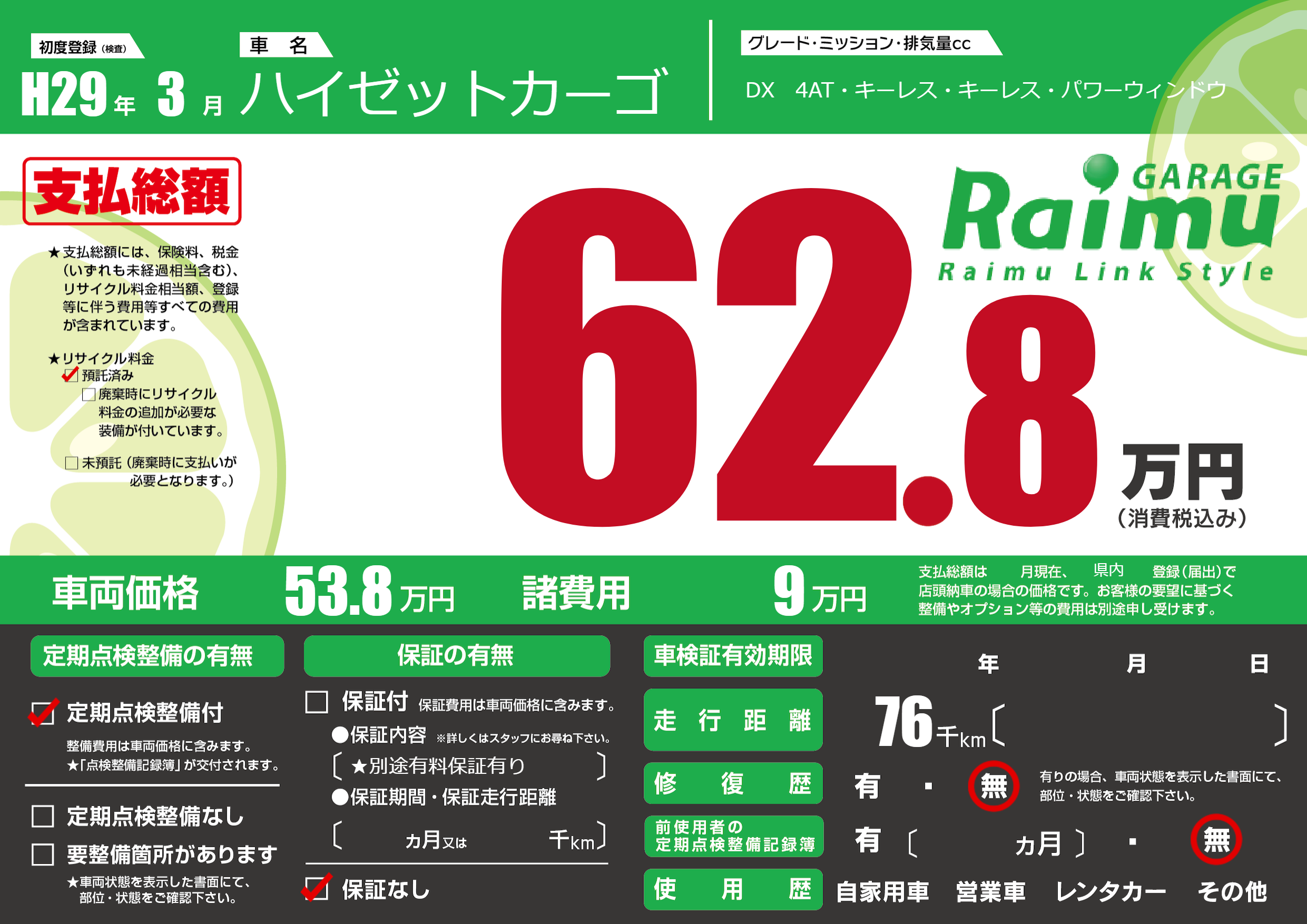 | 車名 | ハイゼットカーゴ | グレード ミッション 排気量 |
