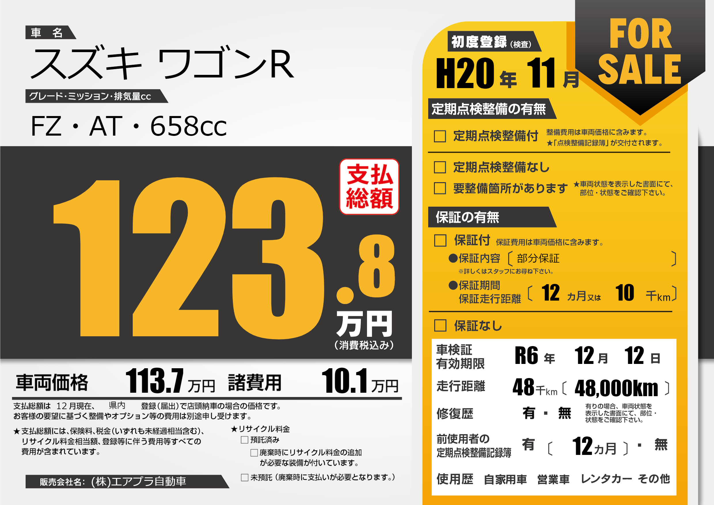 | 走行キロ | 4.8万km | 初年度登録 | H20年11月 |