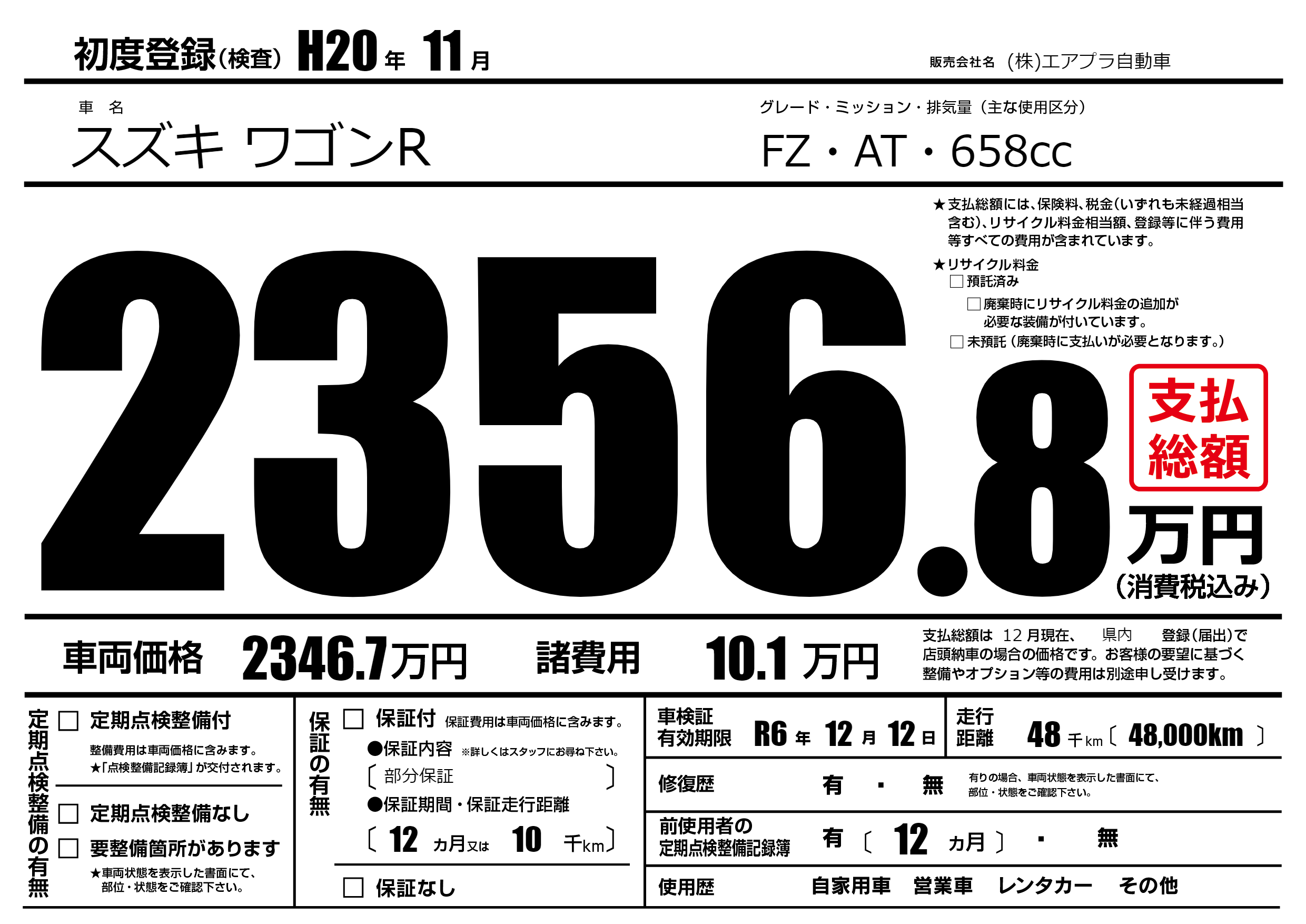 | 車名 | スズキ ワゴンR | グレード ミッション 排気量 |