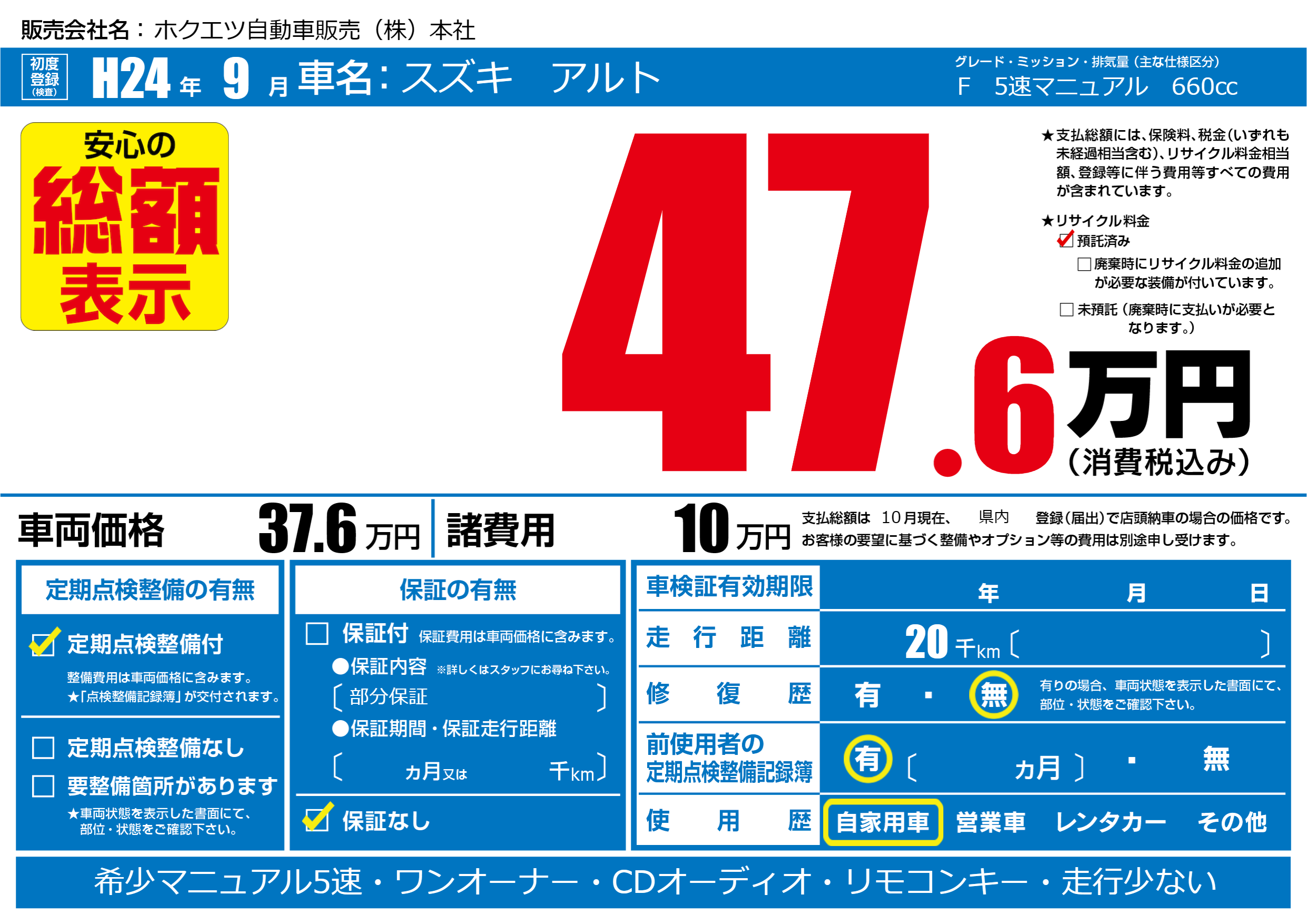 | 車名 | スズキ アルト | グレード ミッション 排気量 |