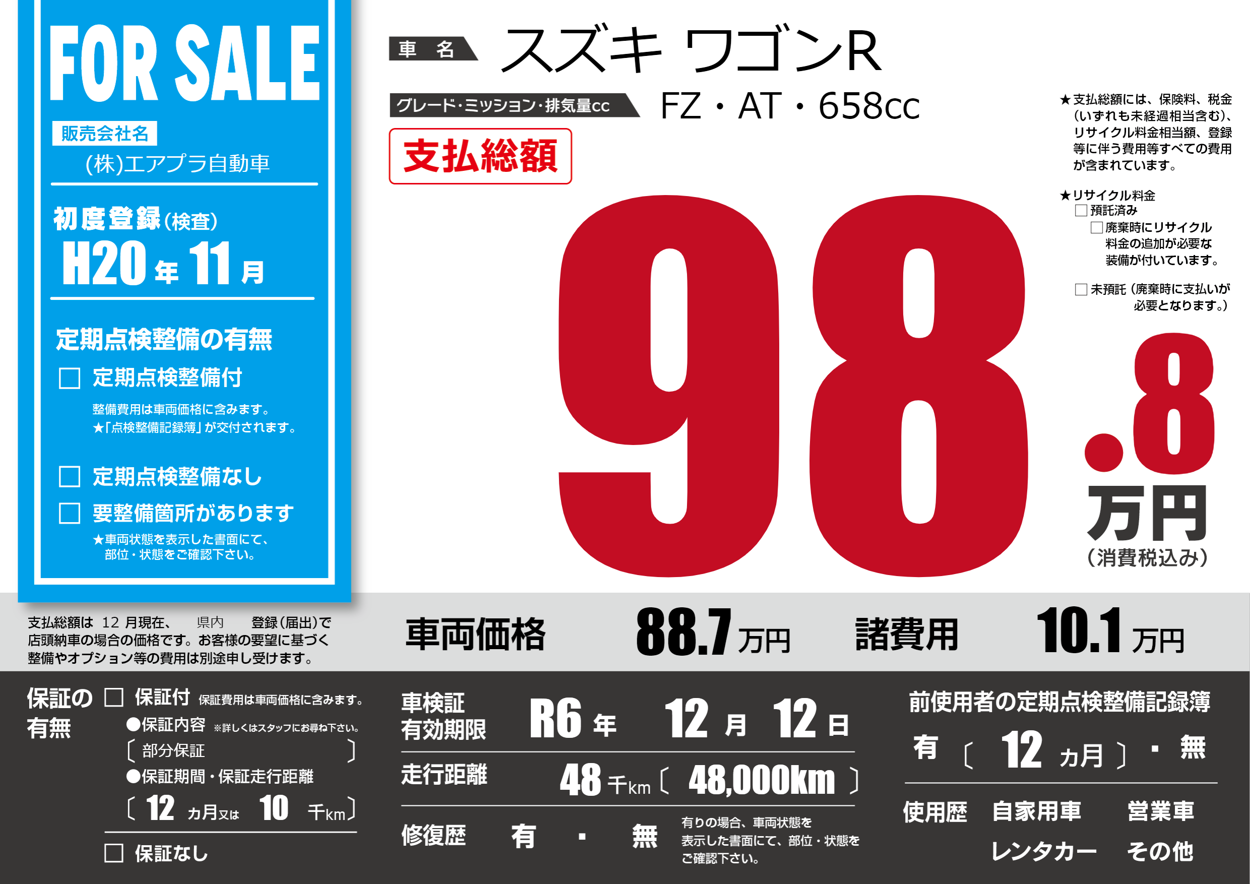 | 車名 | スズキ ワゴンR | グレード ミッション 排気量 |