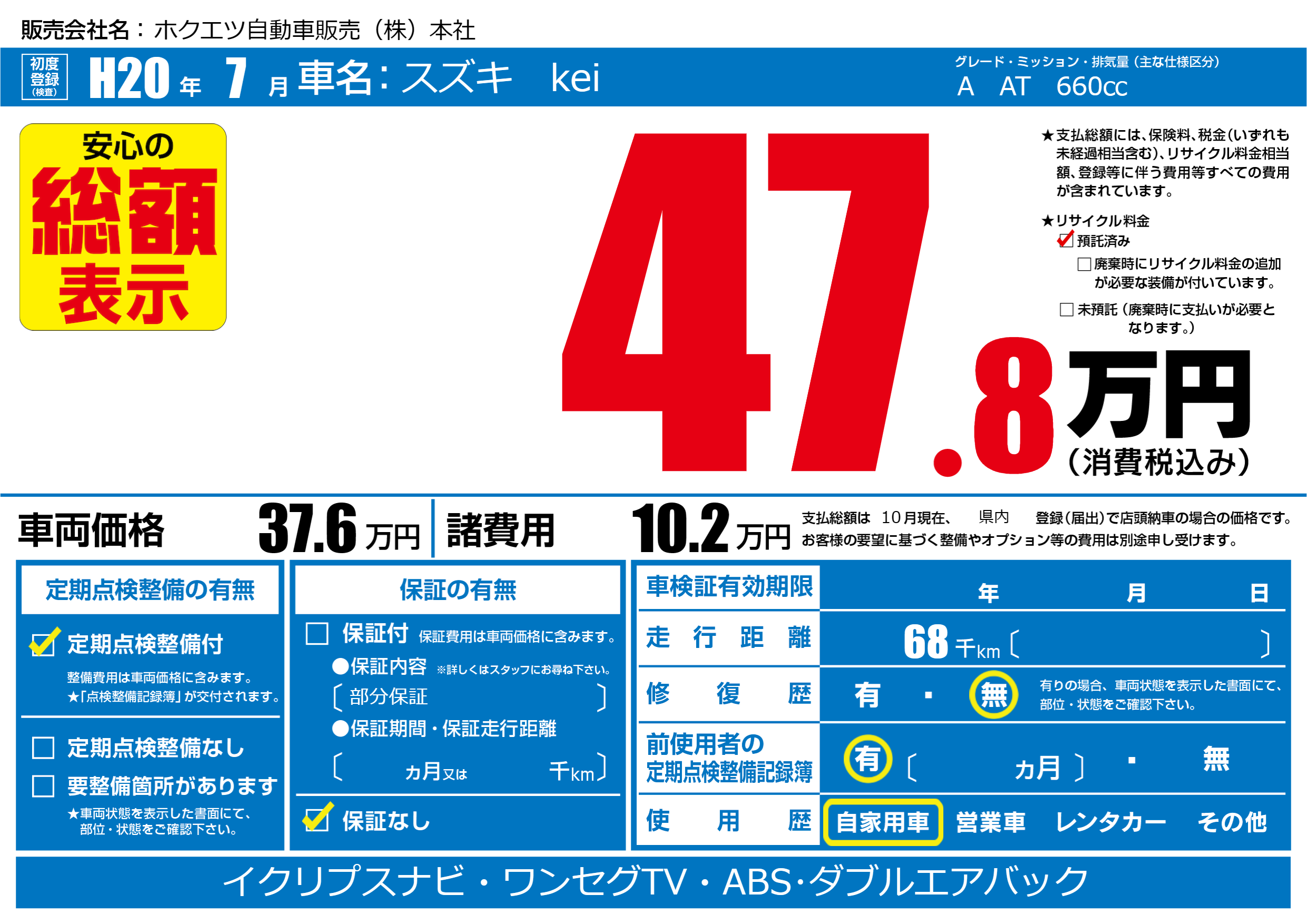| 走行キロ | 6.8万km | 初年度登録 | H20年7月 |
