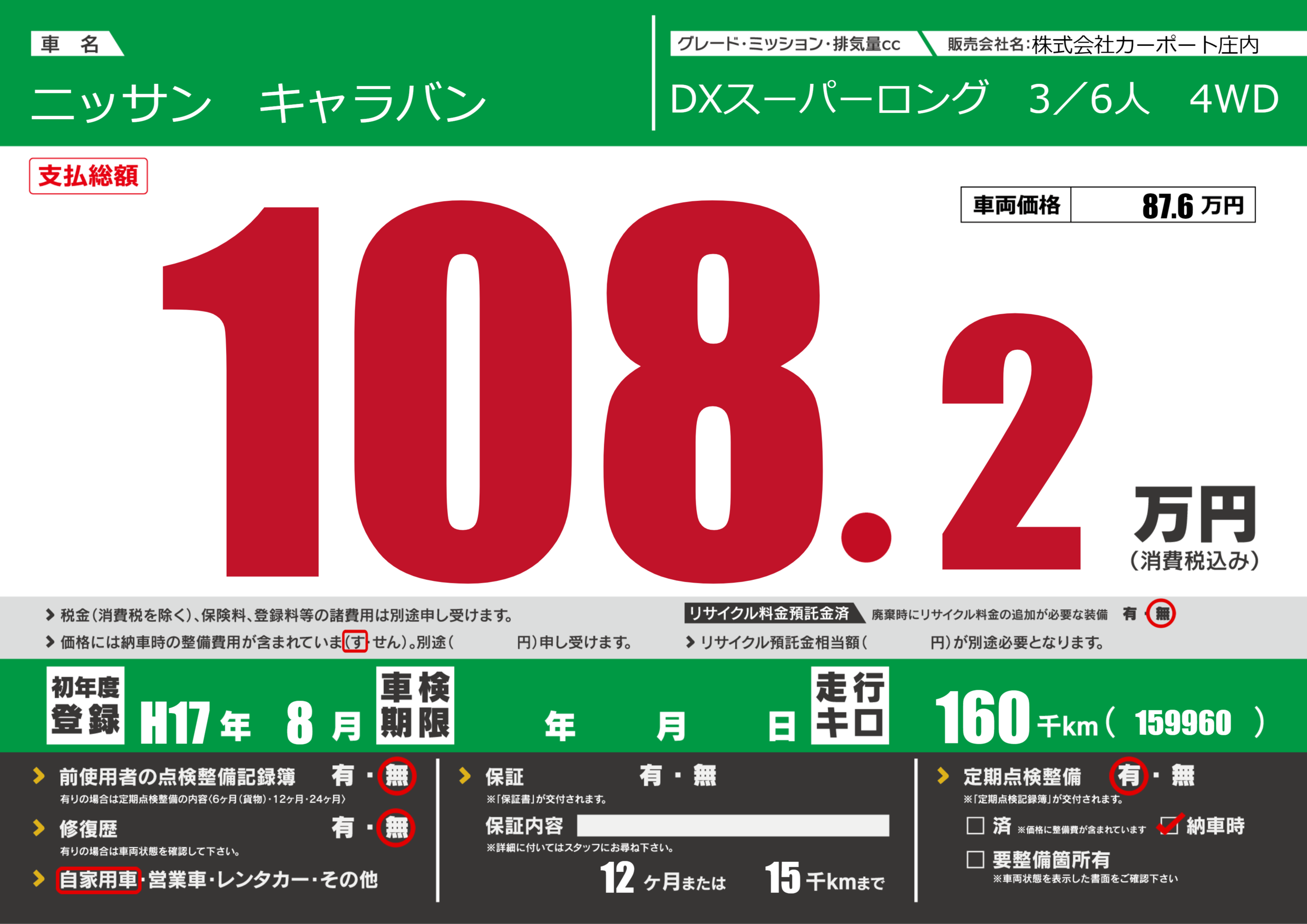 | 定期点検整備 | 定期点検整備あり 納車時あり | ||