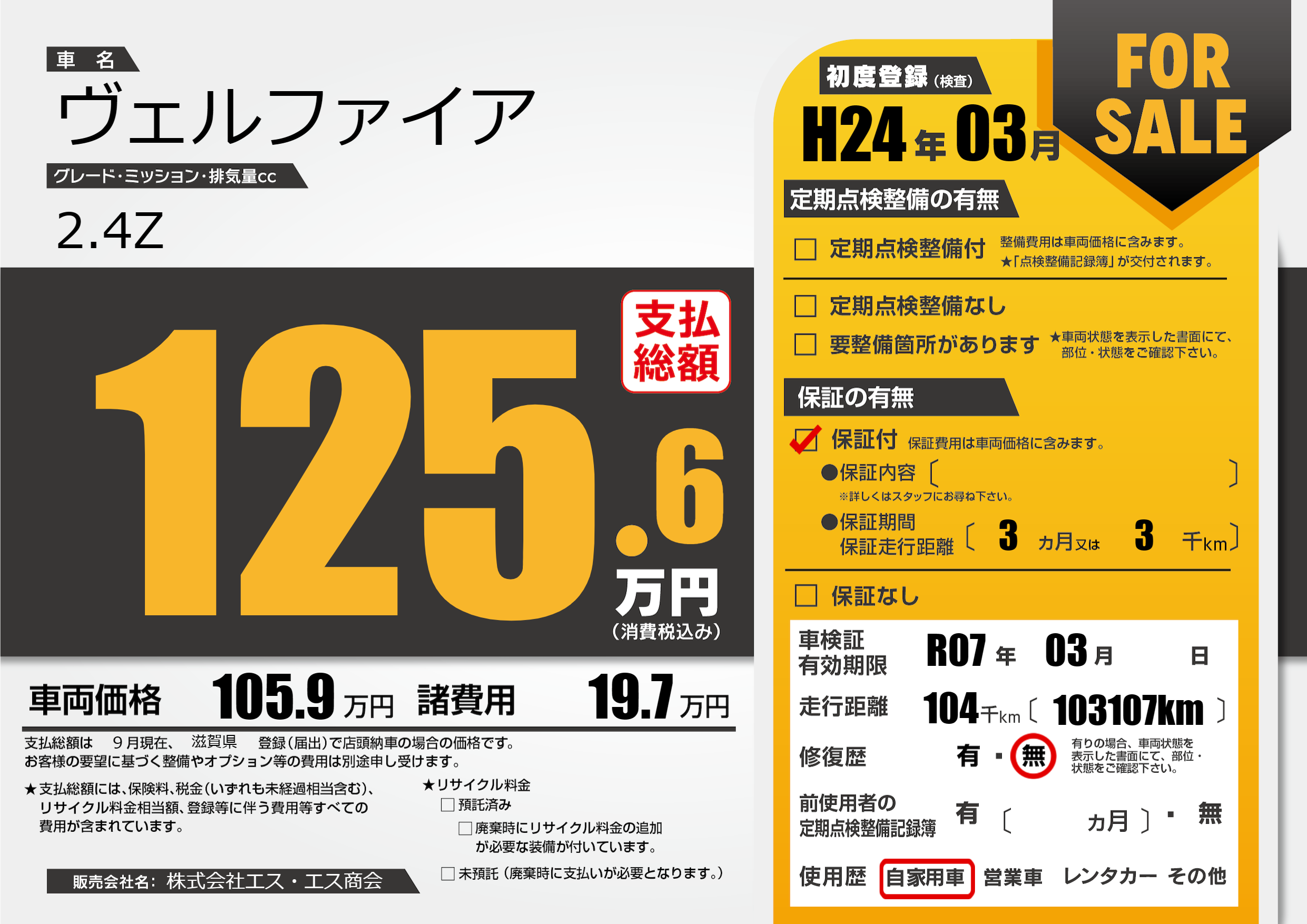 | 車名 | ヴェルファイア | グレード ミッション 排気量 |