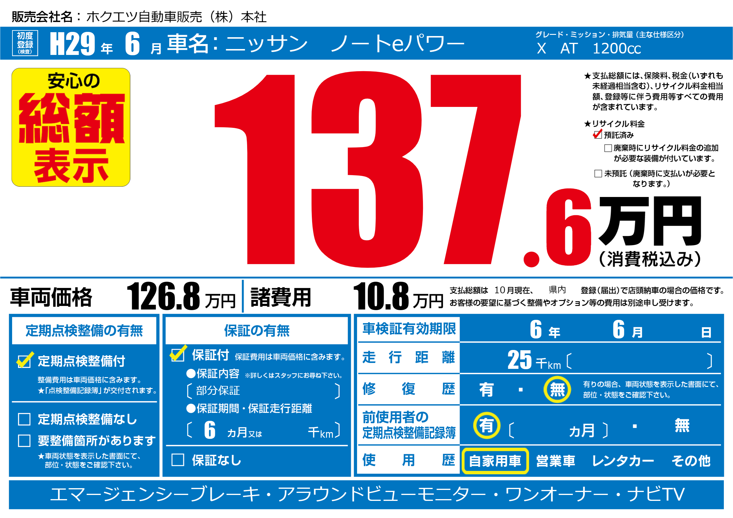 | 車名 | ニッサン ノートeパワー | グレード ミッション 排気量 |