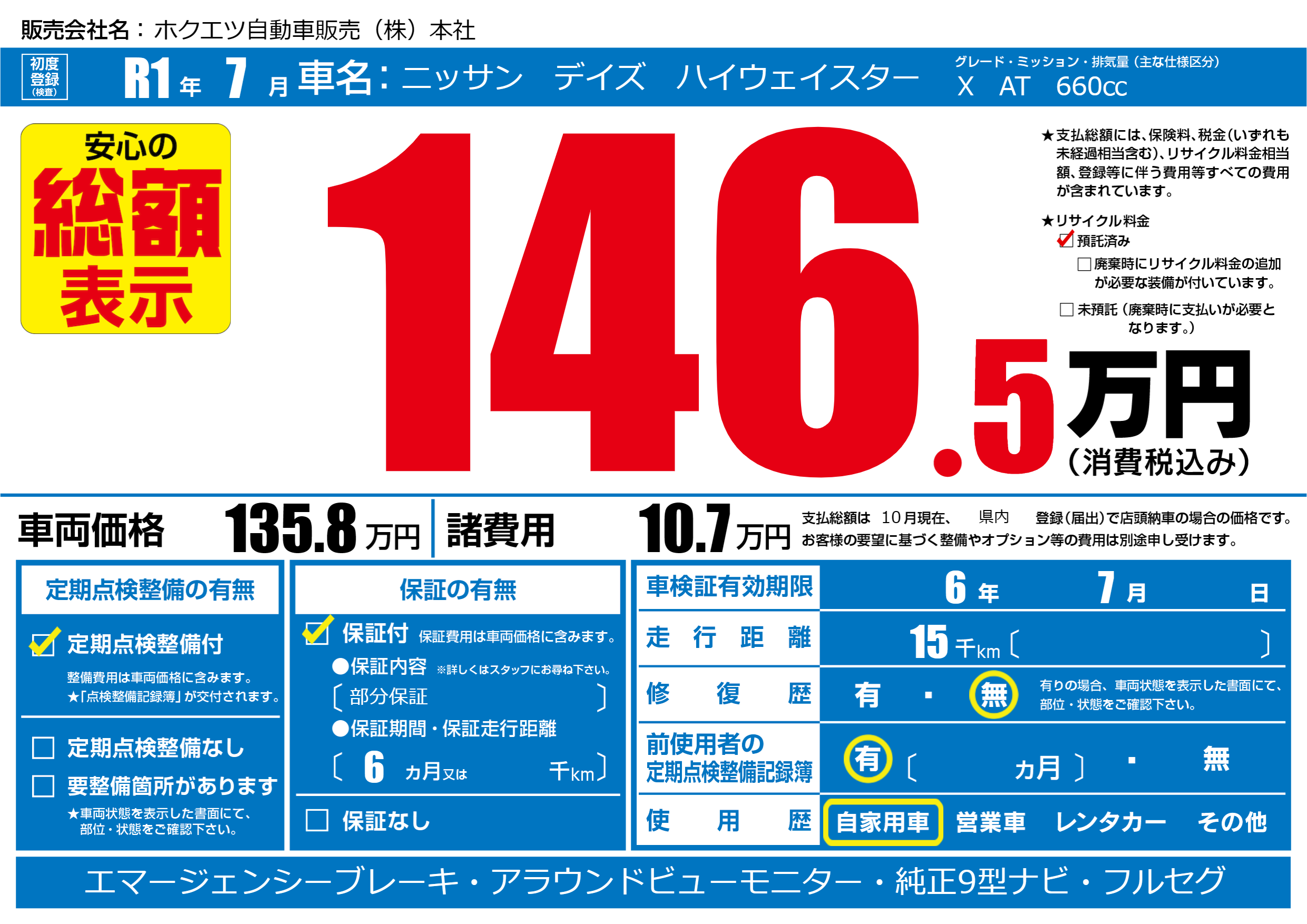 | 車名 | ニッサン デイズ ハイウェイスター | グレード ミッション 排気量 |