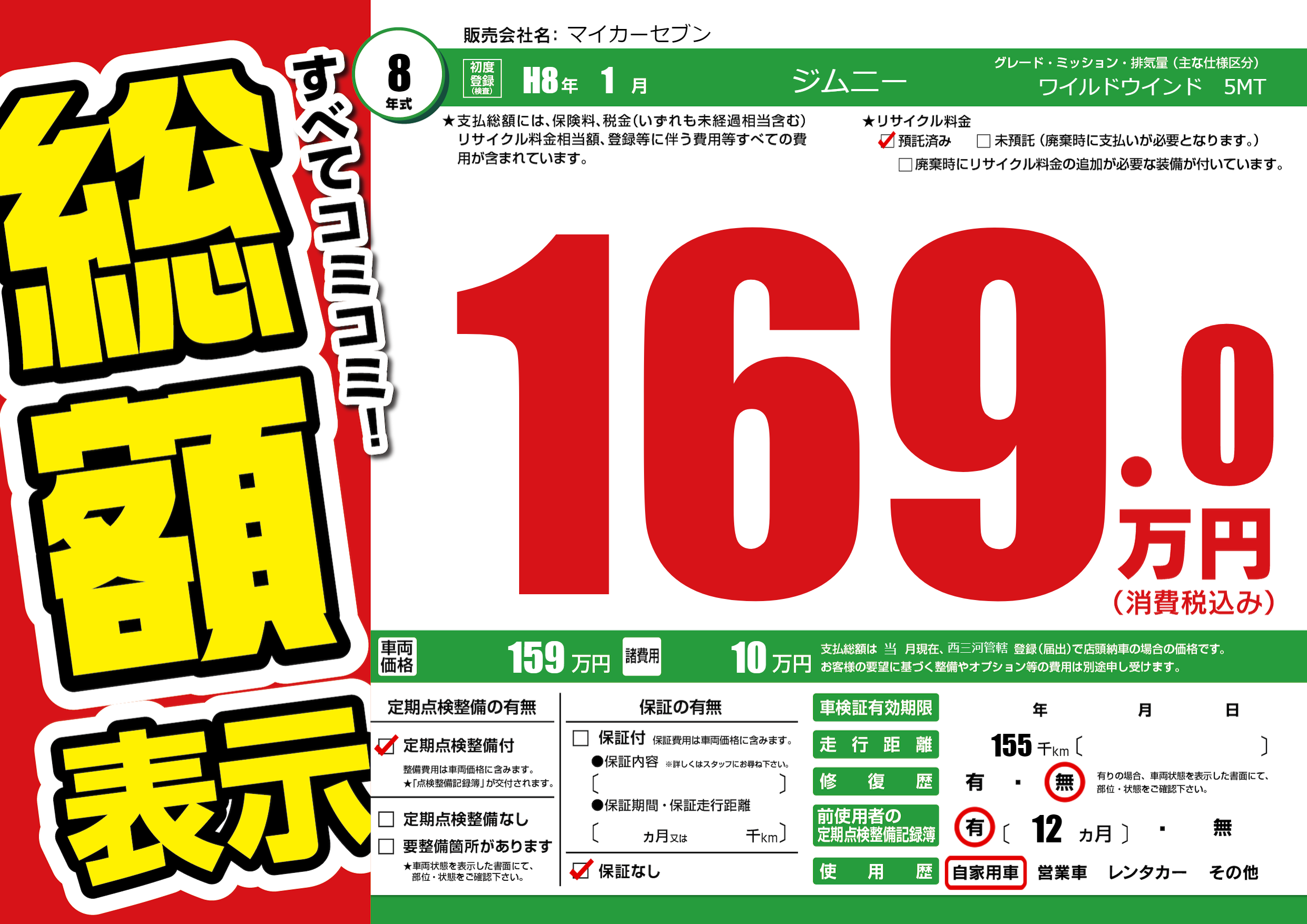 | 走行キロ | 15.5万km | 初年度登録 | H8年1月 |