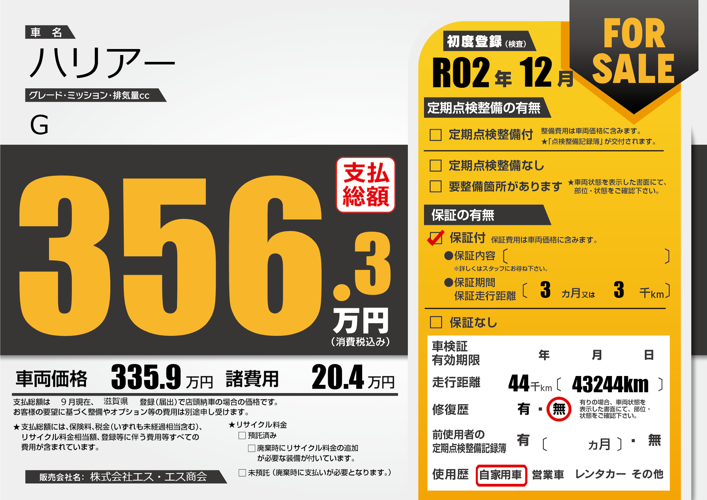 | 走行キロ | 4.4万km | 初年度登録 | R02年12月 |
