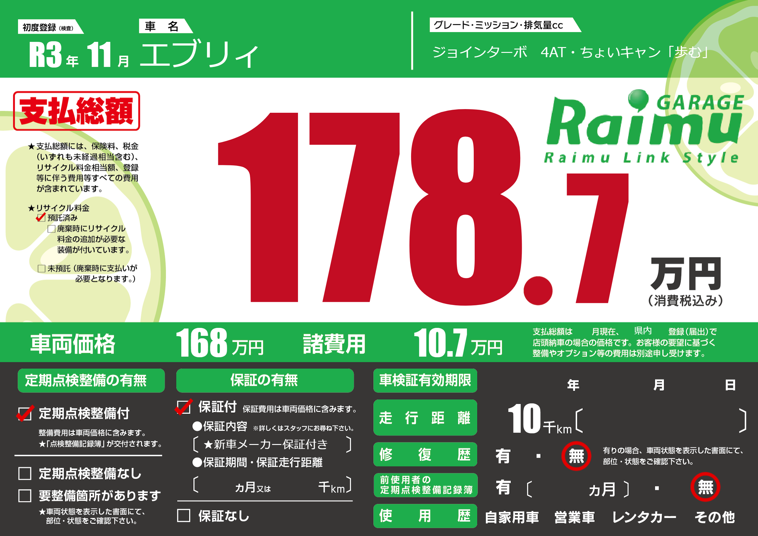 保証付き 保証内容(★新車メーカー保証付き) ---ヶ月または()千kmまで |