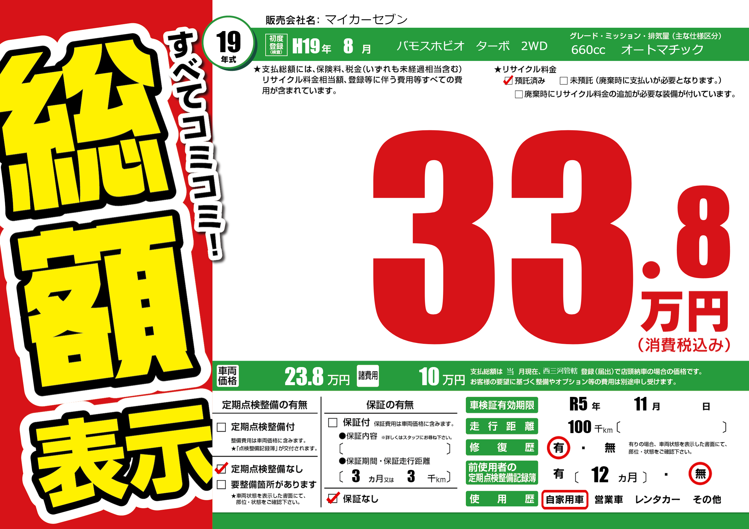 | 車名 | バモスホビオ ターボ 2WD | グレード ミッション 排気量 |