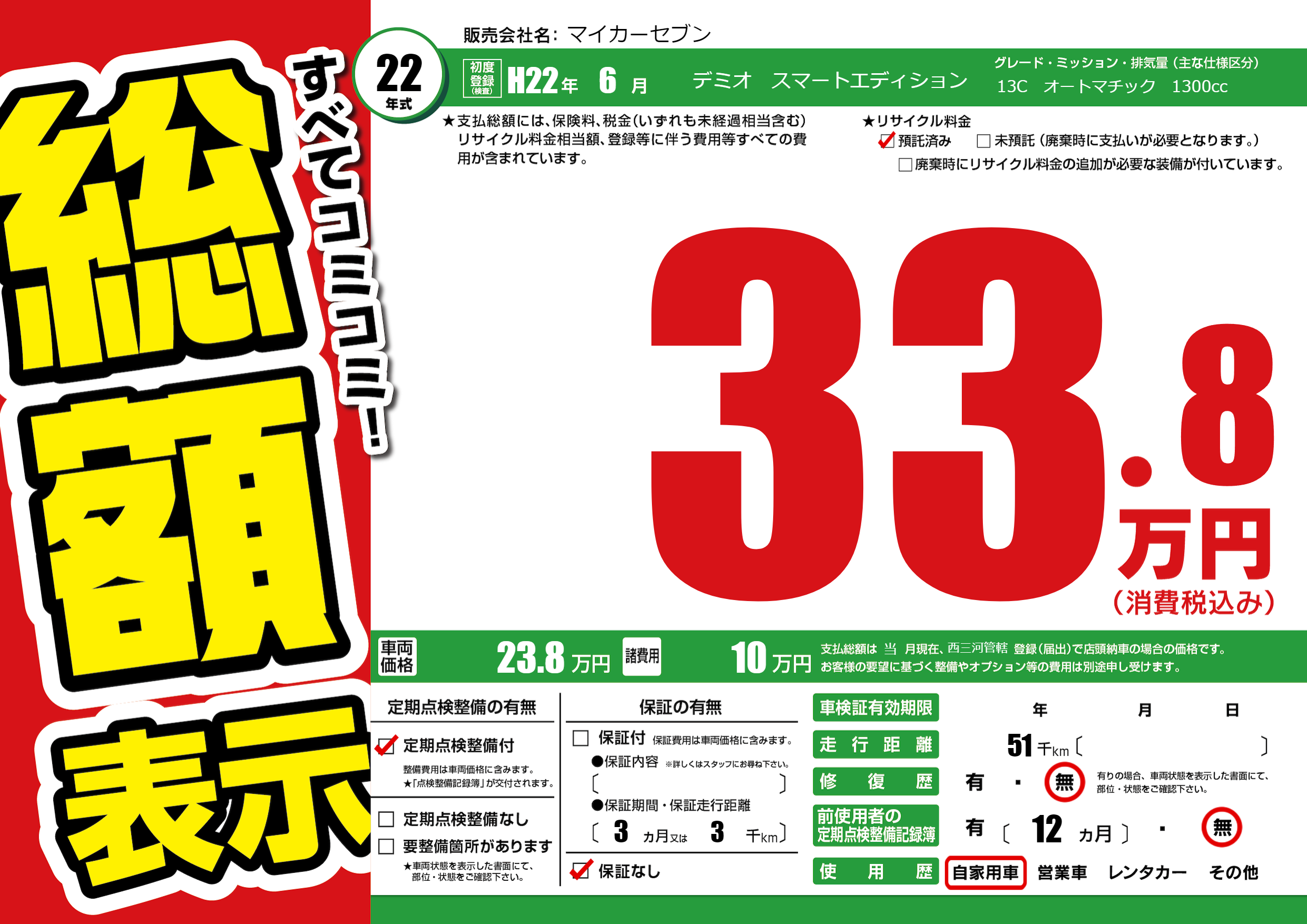 | 車名 | デミオ スマートエディション | グレード ミッション 排気量 |