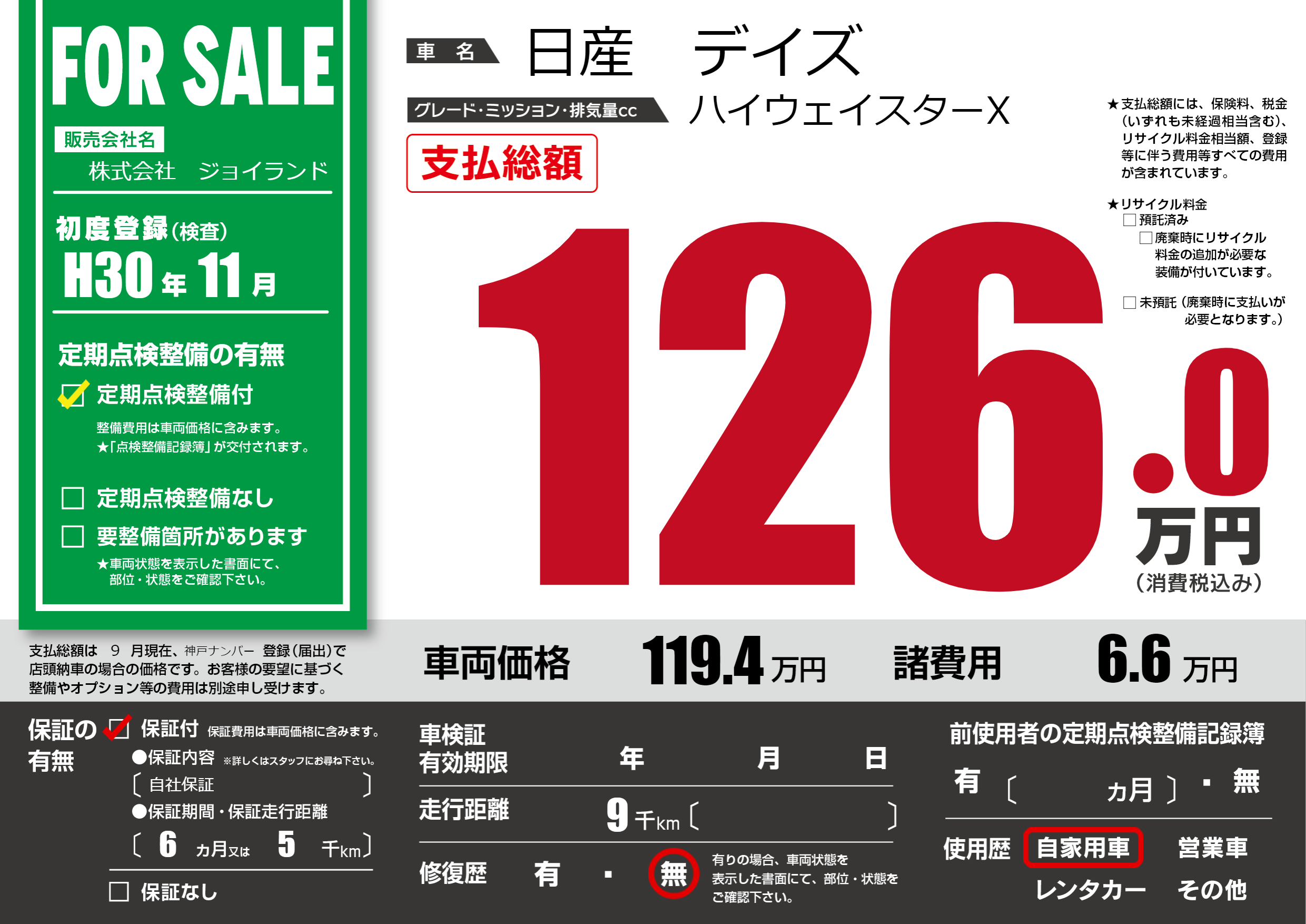 | 走行キロ | 0.9万km | 初年度登録 | H30年11月 |