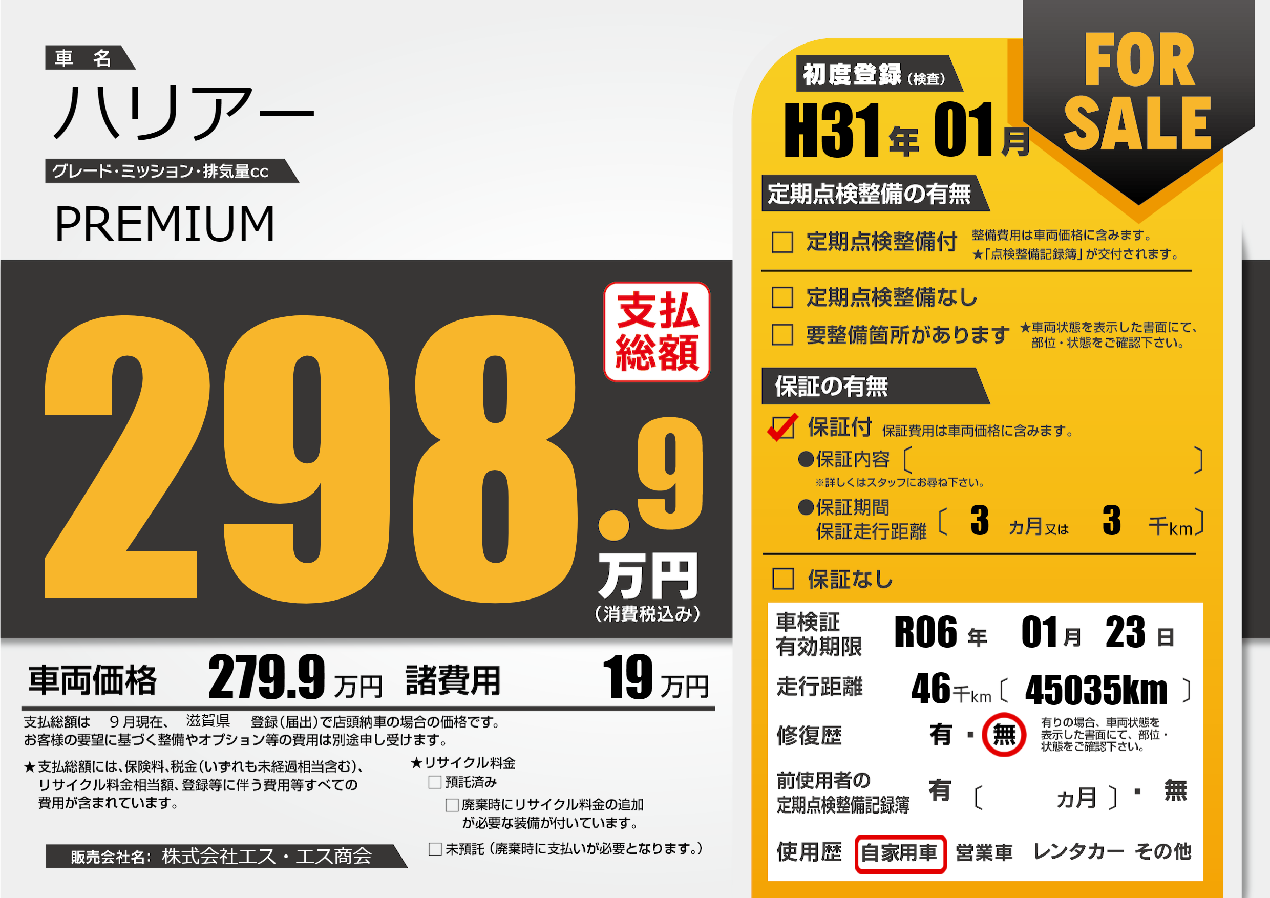 | 走行キロ | 4.6万km | 初年度登録 | H31年01月 |
