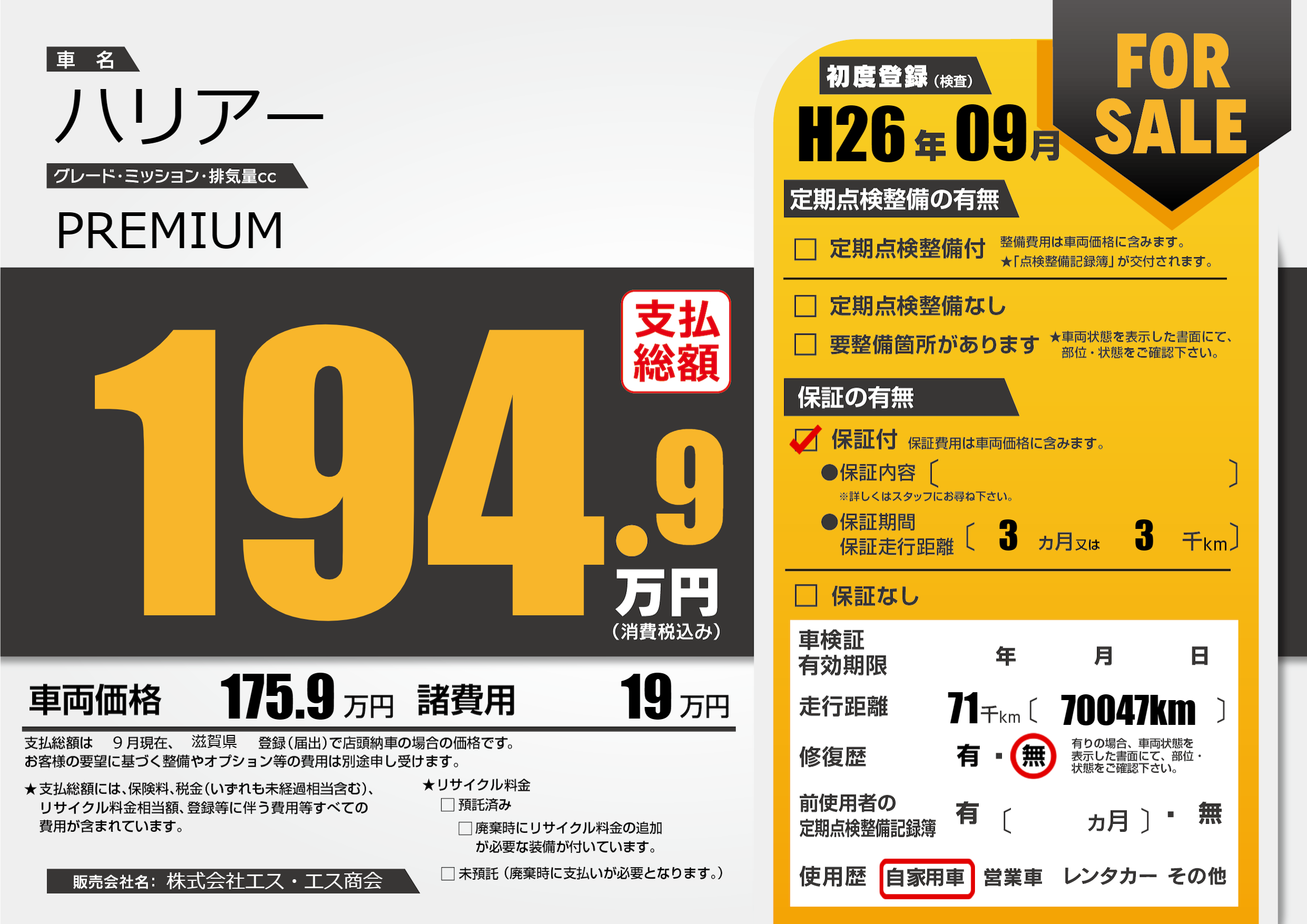 | 走行キロ | 7.1万km | 初年度登録 | H26年09月 |