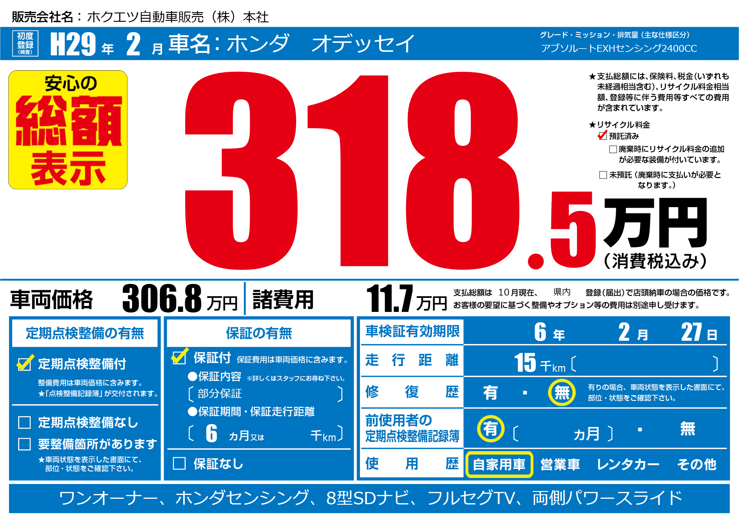 | 車名 | ホンダ オデッセイ | グレード ミッション 排気量 |