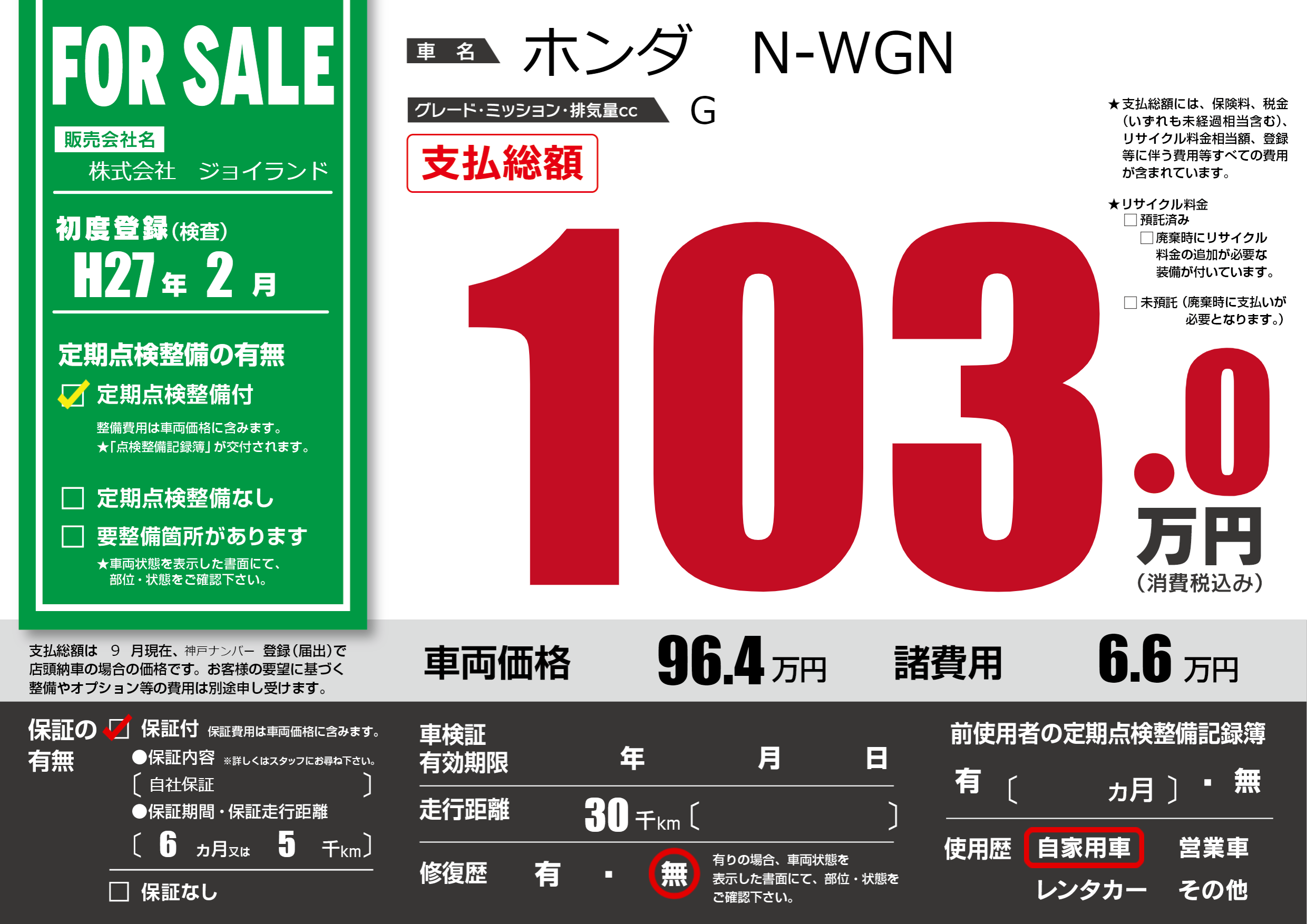 保証付き 保証内容(自社保証) 6ヶ月または5千km |
