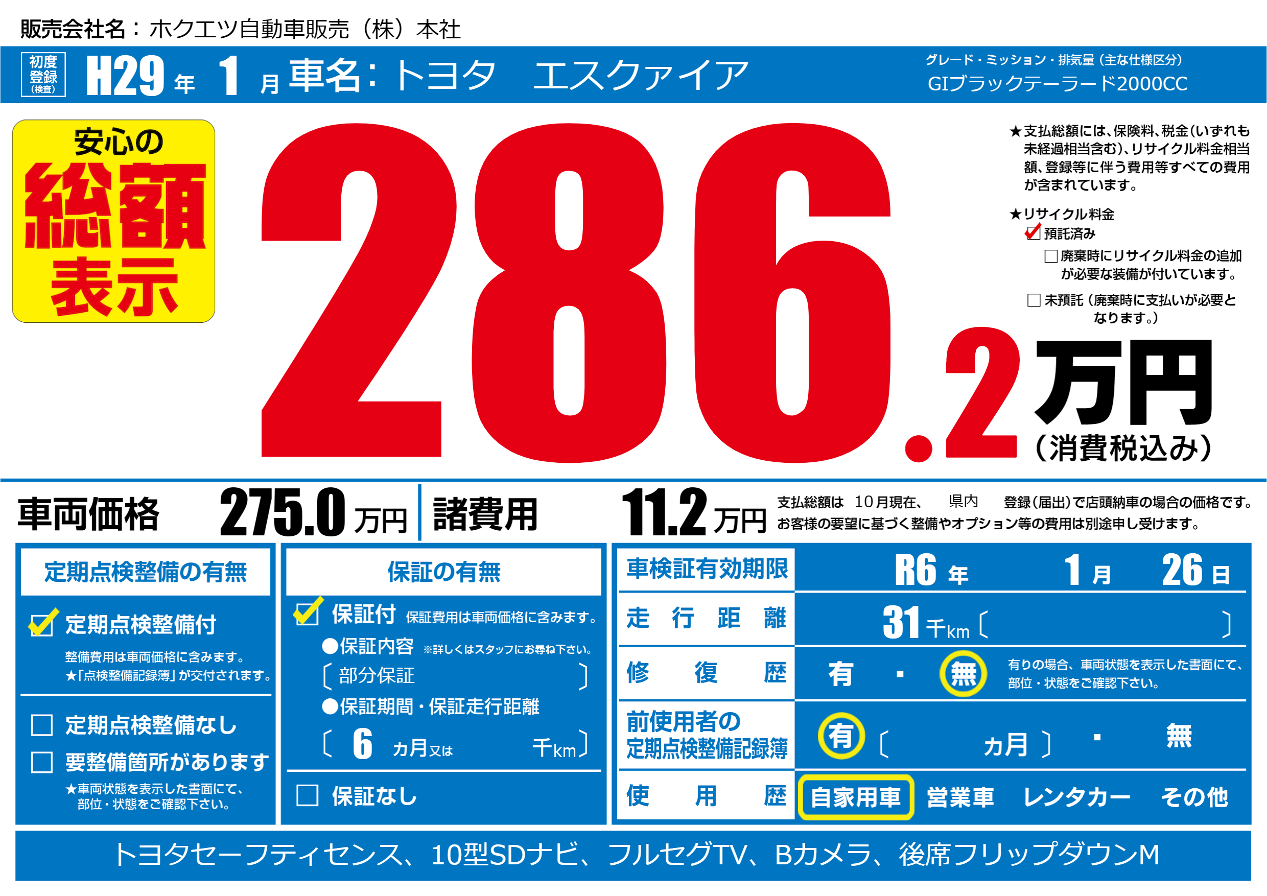 | 車名 | トヨタ エスクァイア | グレード ミッション 排気量 |