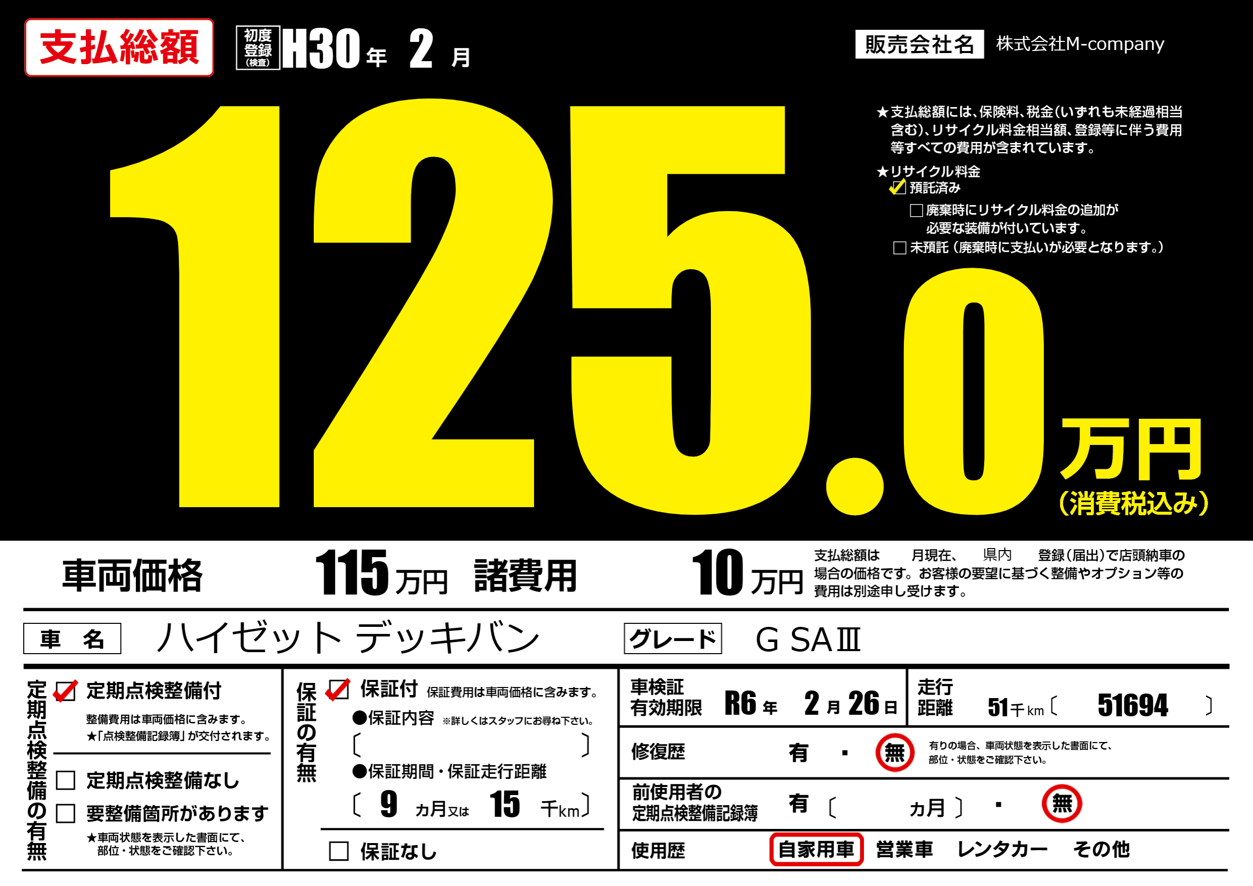| 走行キロ | 5.1万km | 初年度登録 | H30年2月 |