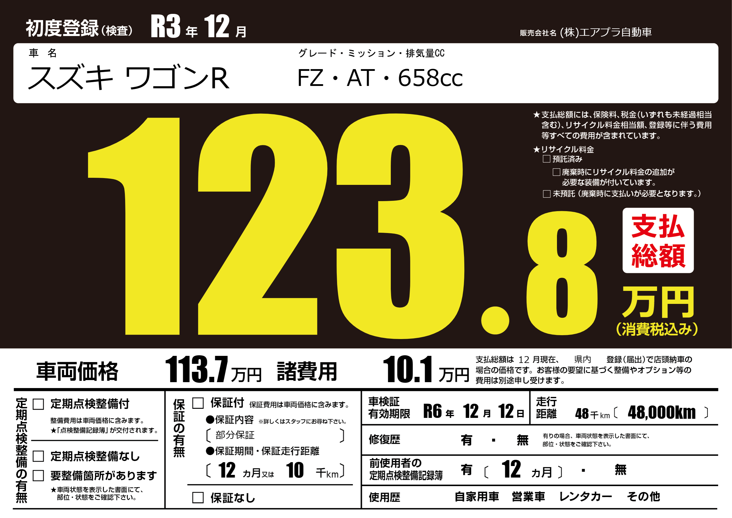 | 車名 | スズキ ワゴンR | グレード ミッション 排気量 |
