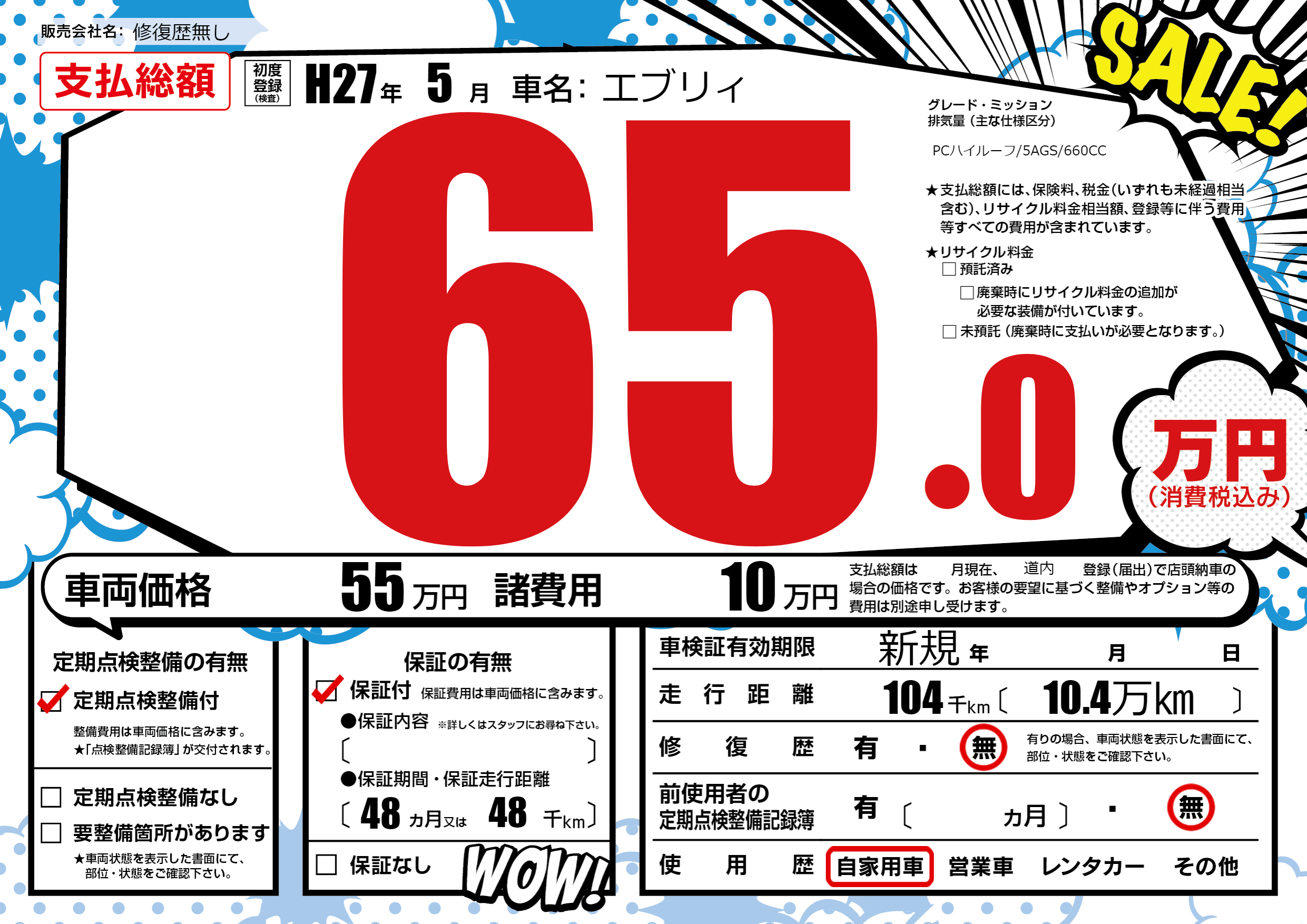 | 走行キロ | 10.4万km | 初年度登録 | H27年5月 |