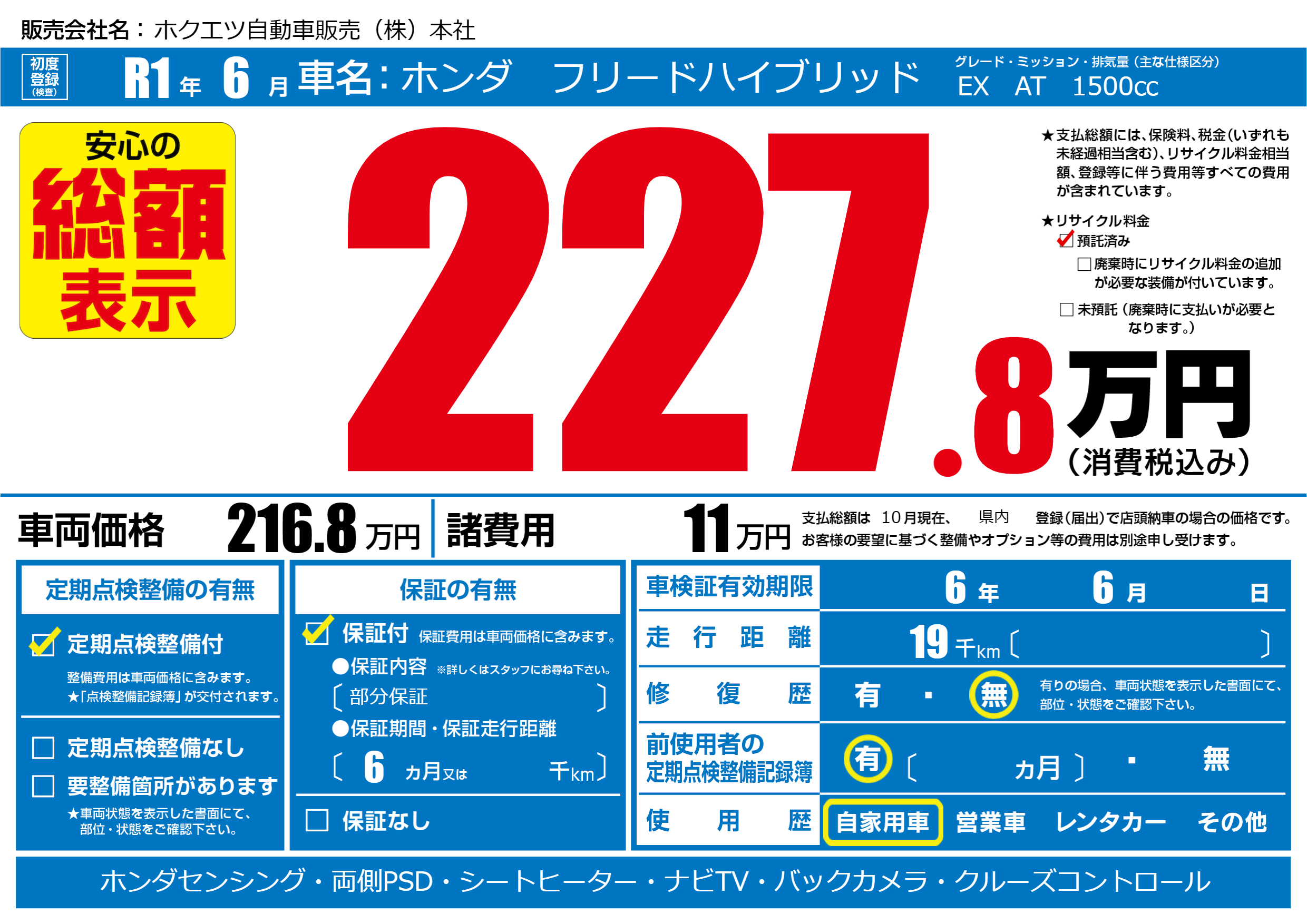 | 車名 | ホンダ フリードハイブリッド | グレード ミッション 排気量 |