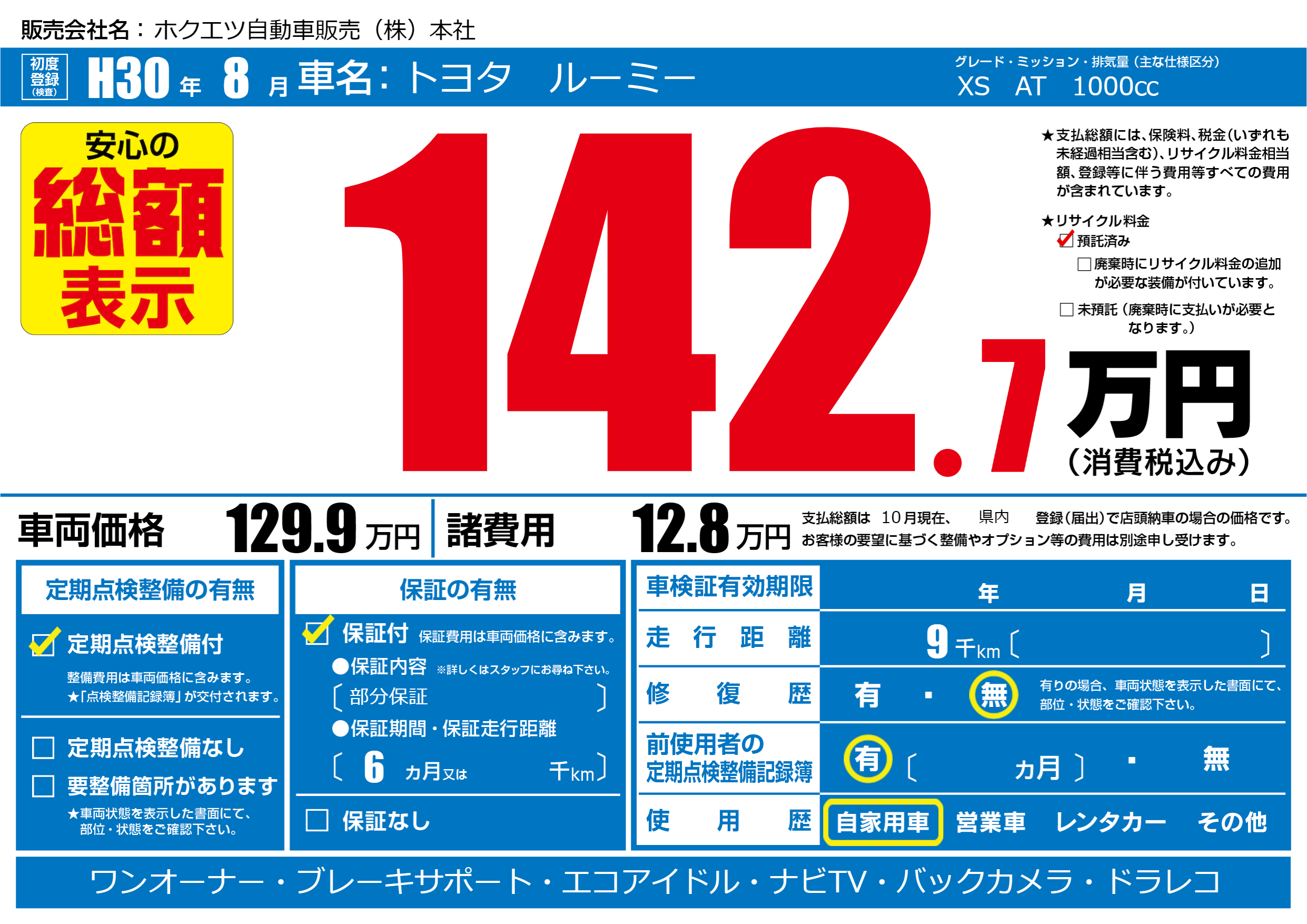 | 車名 | トヨタ ルーミー | グレード ミッション 排気量 |