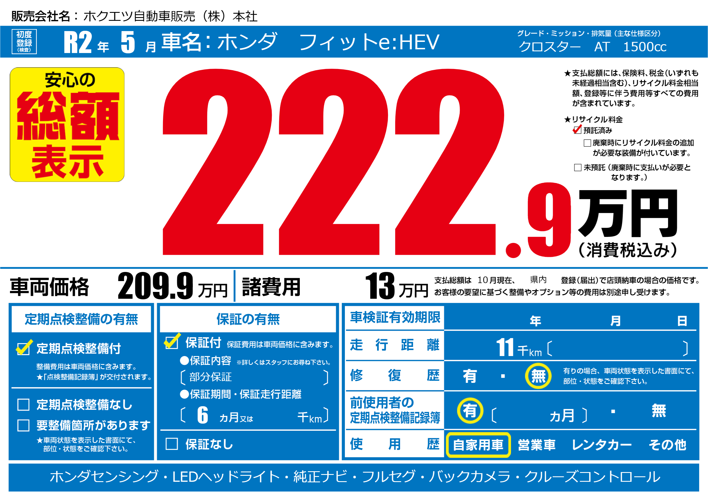 | 車名 | ホンダ フィットe:HEV | グレード ミッション 排気量 |