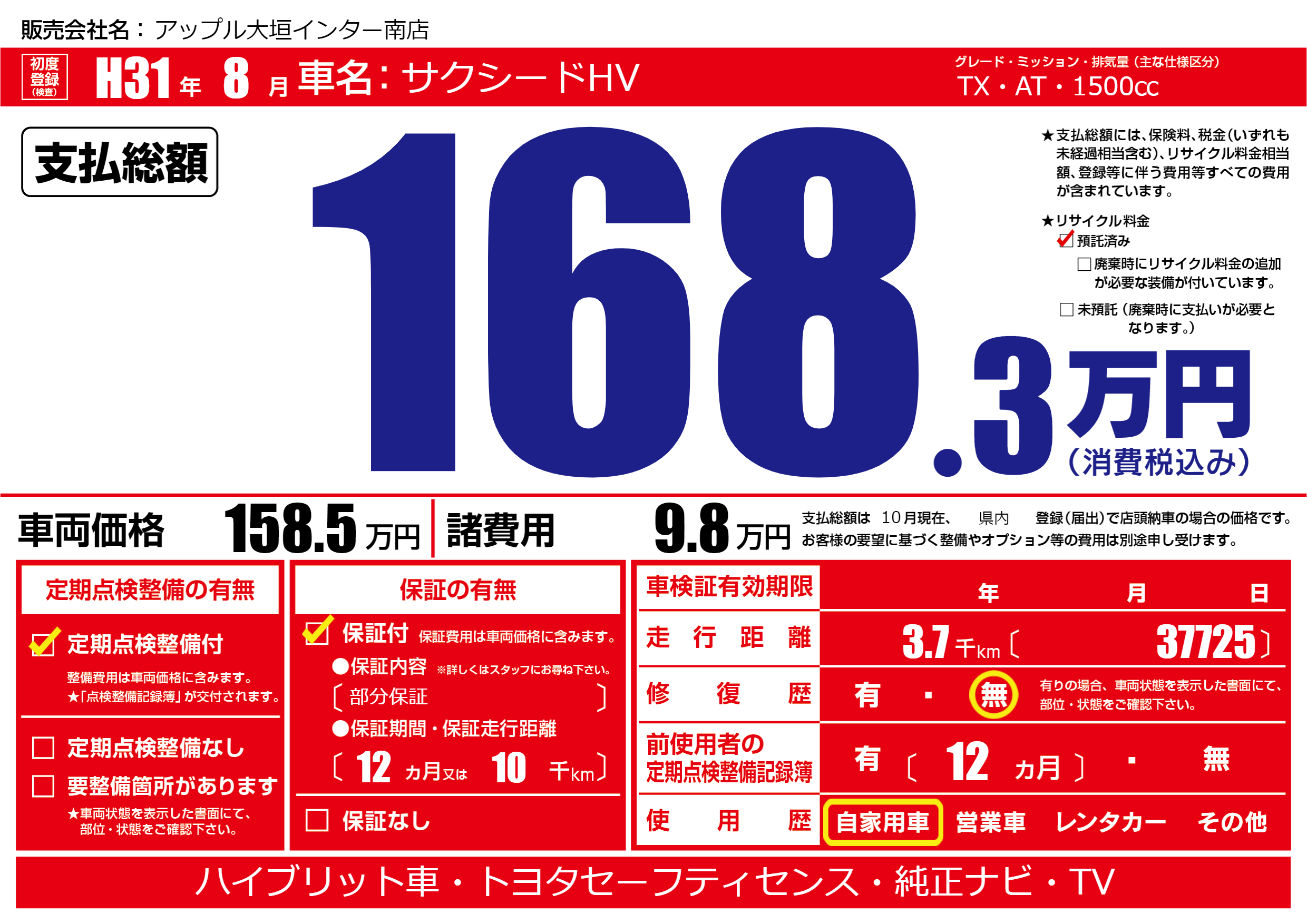 | 走行キロ | 0.3万km | 初年度登録 | H31年8月 |