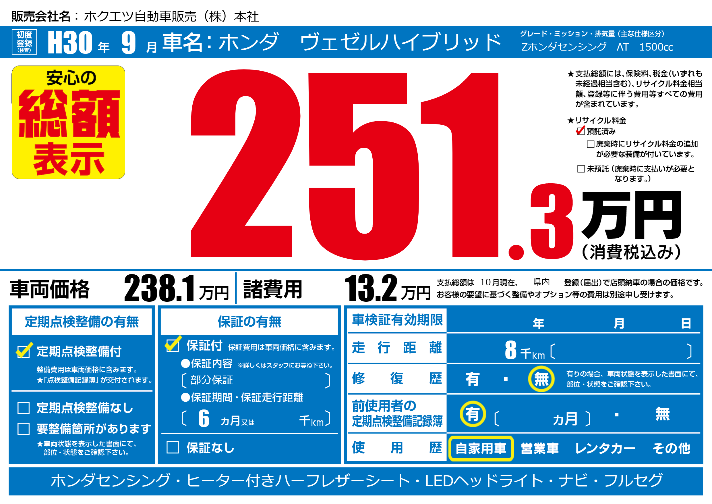 | 車名 | ホンダ ヴェゼルハイブリッド | グレード ミッション 排気量 |